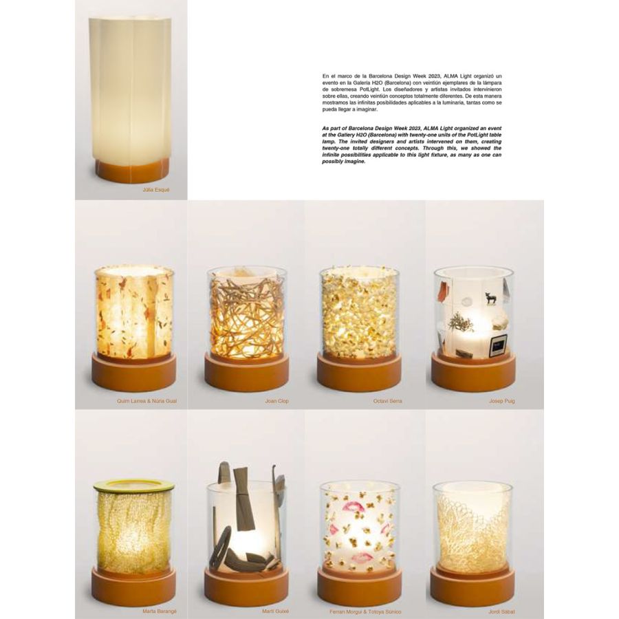 Kolekcja POTLIGHT ma tylko jeden model, a ALMA Light zawsze dostarcza go z dwoma wypełnieniami dołączonymi do opakowania: jednym z pięknymi wiórami drewna i drugim z ładnym, ręcznie robionym papierem. Podstawa jest ceramiczna/gliniana o średnicy 21cm, a całkowita wysokość wynosi 26cm. Podwójny abażur składa się z dwóch cylindrów ze szkła borokrzemowego: przezroczystego zewnętrznego szkła oraz piaskowanego, bardziej nieprzezroczystego szkła wewnętrznego. POTLIGHT zawiera oprawkę E27, więc temperaturę barwową światła i moc dobiera użytkownik przy wyborze żarówki. Posiada przewód z włącznikiem włącz/wyłącz, bez ściemniacza.