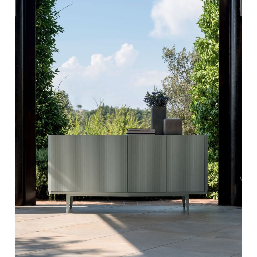 4-door wooden sideboard with a simple and contemporary design. The style of the contemporary structure emphasises linearity and the detail of elegance. The metal base, colour-matched to the legs, supports the structure, giving it a light and comfortable appearance.