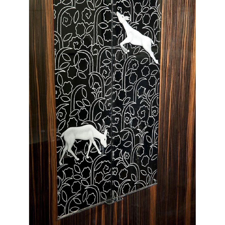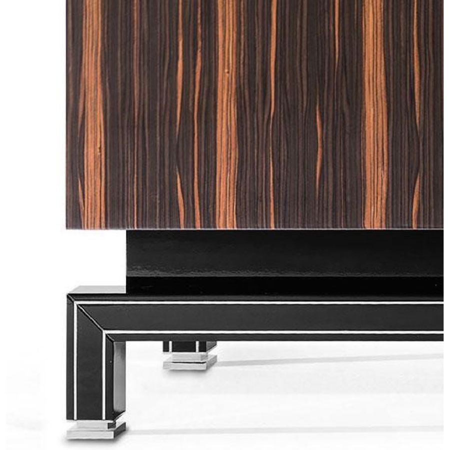 Cabinet in shiny varnished ebony wood and black glass with silvered engravings. Base in shiny black lacquered wood with details in chromed brass.