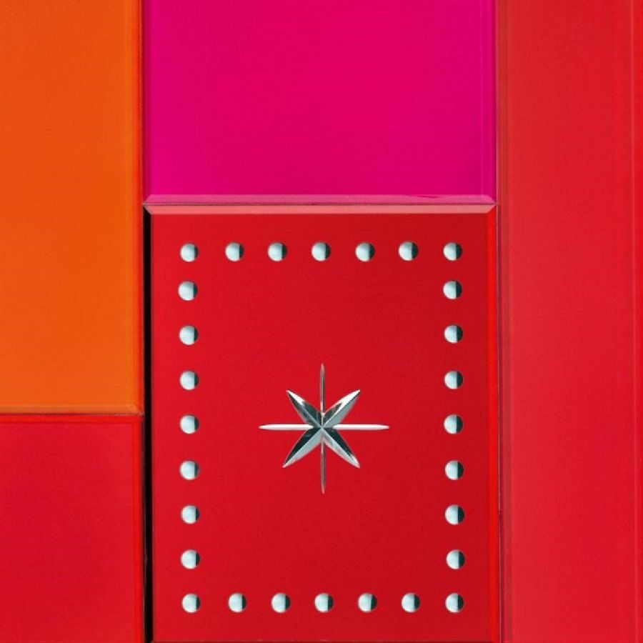Top, doors, sides and back-side made of coloured and lacquered glass.