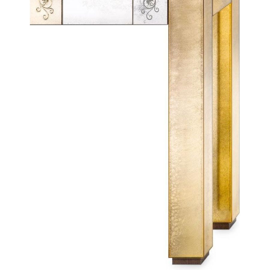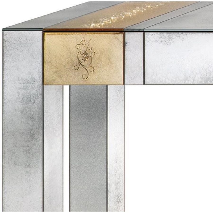 Handmade console table with bands in antiqued mirror and multicoloured glass with floral handmade engravings.