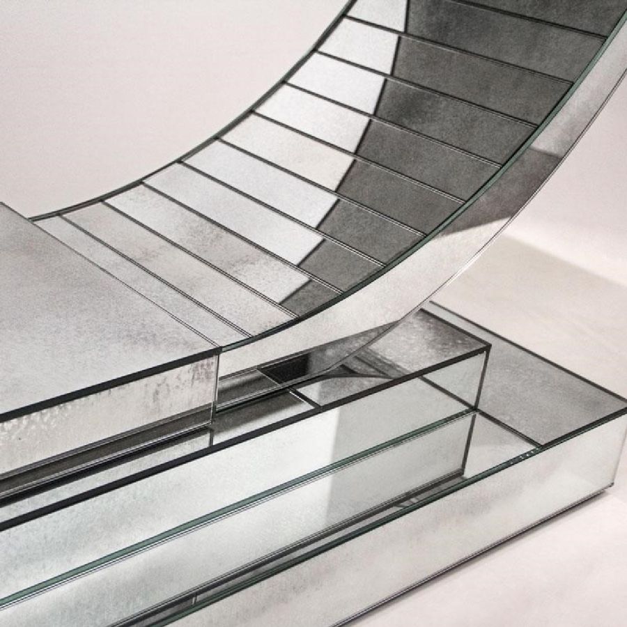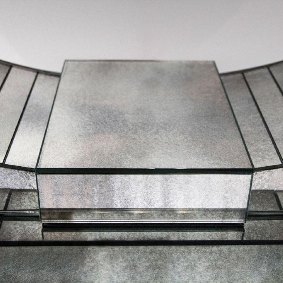 Structure made of wood. U-shaped base made of glass tiles with medium antique mirrored finish.