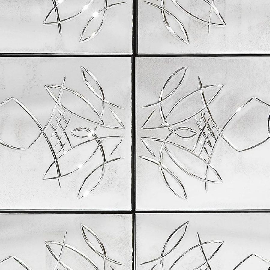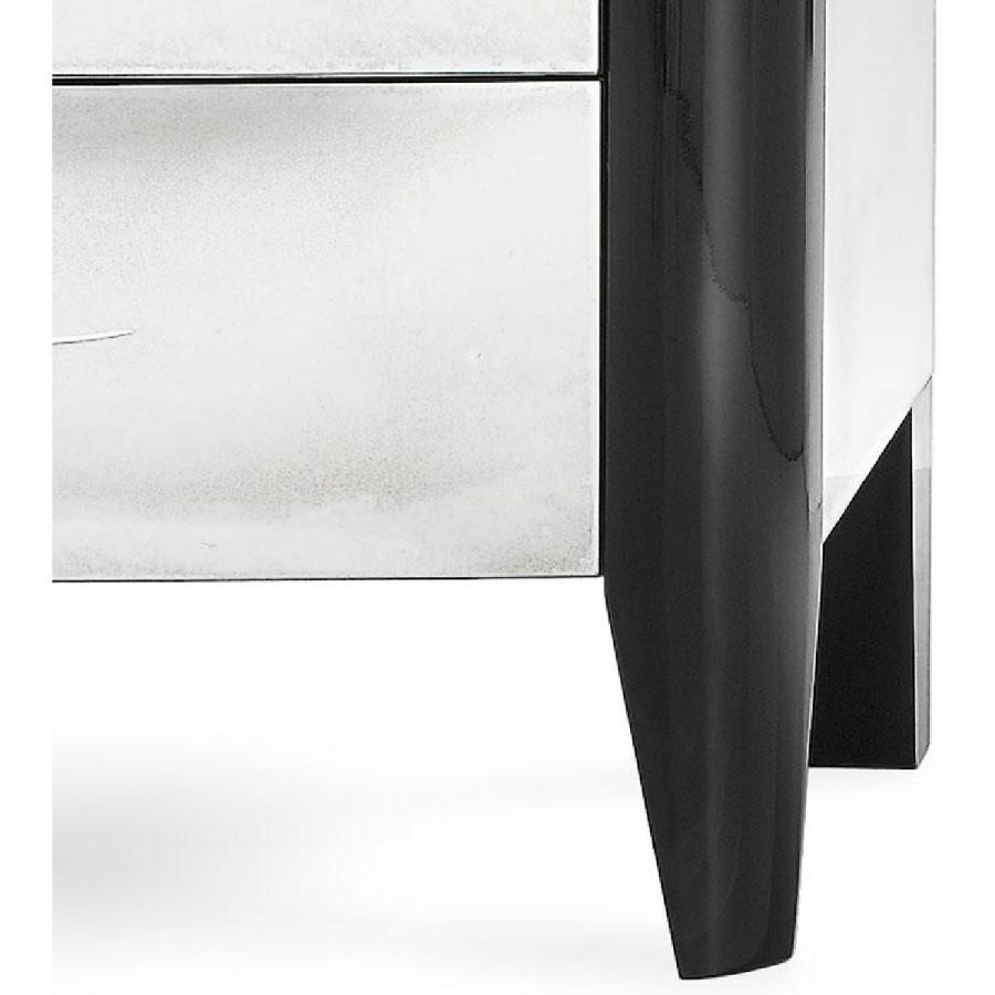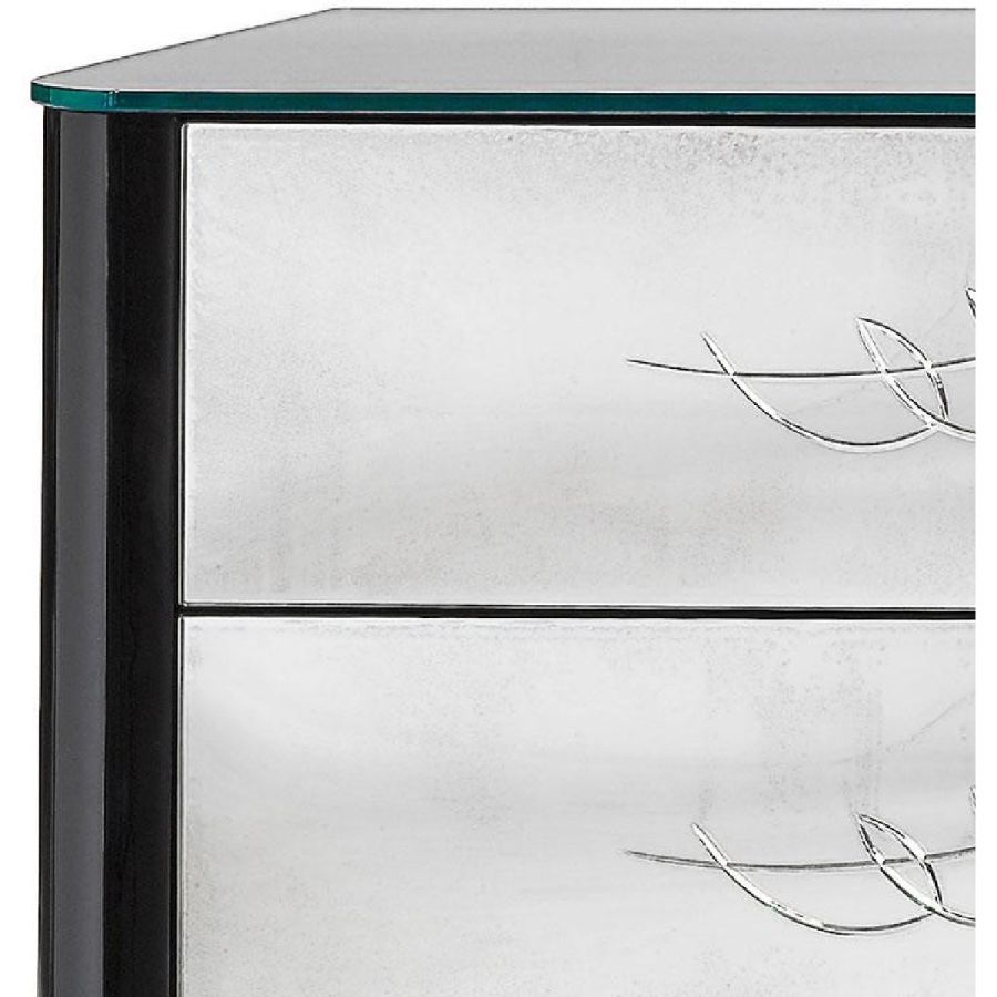 Top made of medium antique mirrored glass with rounded corners. Sides made of medium antique mirrored glass. Back made of wood with black matte finish. Drawers made of engraved glass with medium antique mirrored finish.