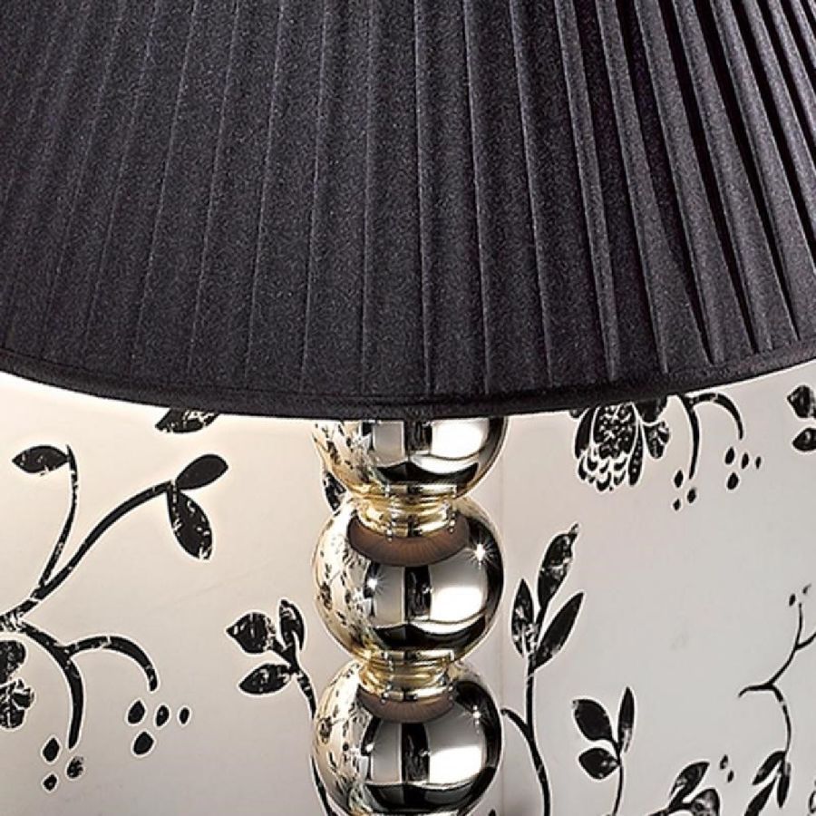 Art Déco Table Lamp with one light. Base in shiny black lacquered wood and silvered spheres. Lampshade in black pleated fabric.