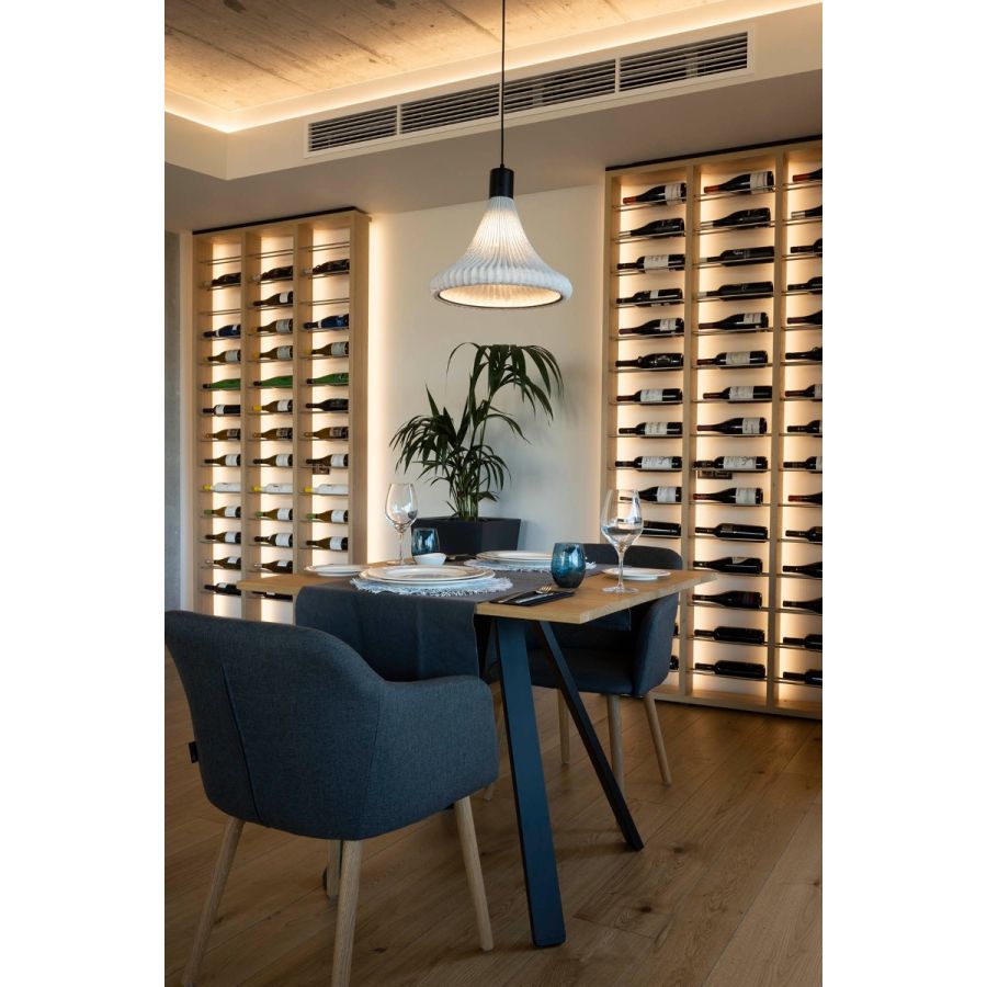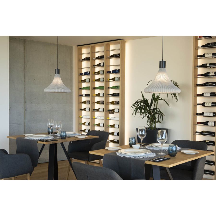 Inn to nowy projekt, w którym siatka ze stali nierdzewnej nadal odgrywa główną rolę i gdzie kształty geometryczne są reinterpretowane z organicznym akcentem. Ta lampa towarzyszy naszym premierom z 2021 roku w evo-lution i stanowi część projektów nowej fazy jako a-emotional light. Zanurzamy się w emocjach i łączymy linie jako ścieżki, które zawsze prowadzą do tego wspólnego miejsca: światła.