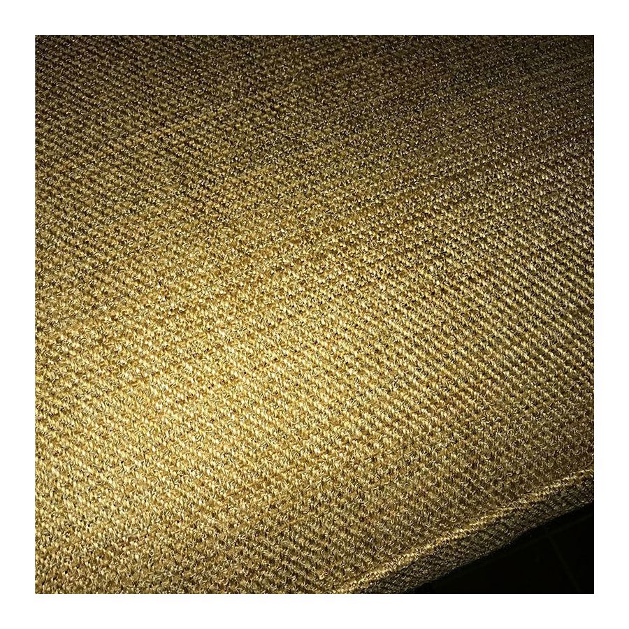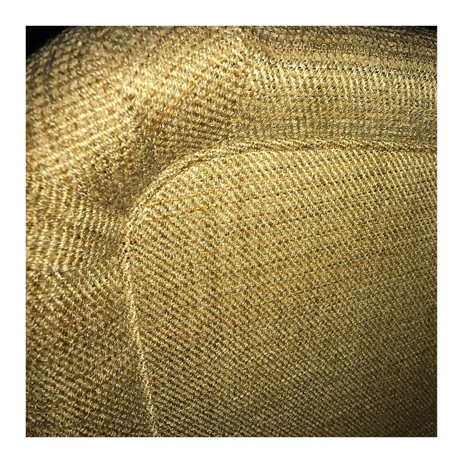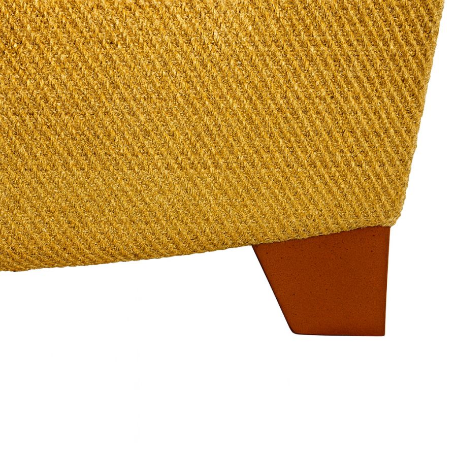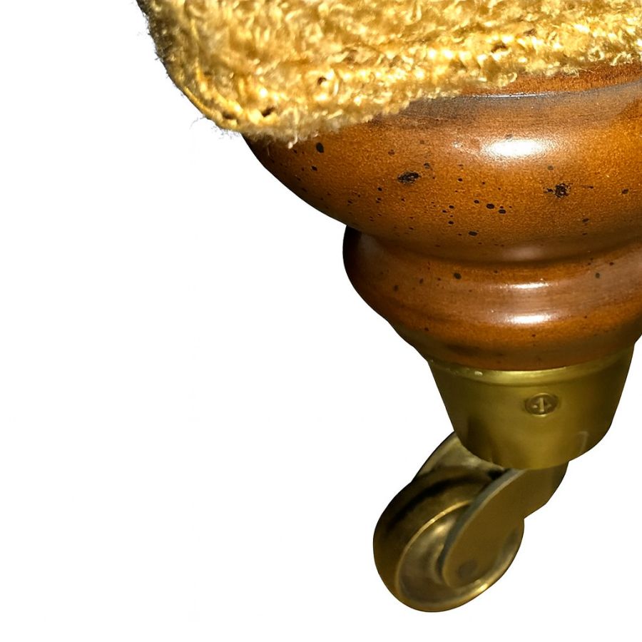 Premium Natural Materials: High-quality expensive fabric in a warm beige-gold shade with clear stitching and solid wood legs with brass casters.