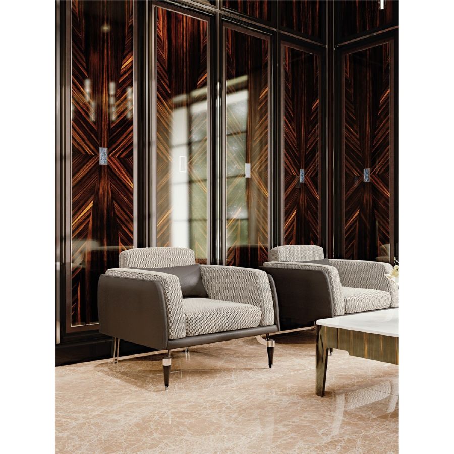 This armchair is upholstered with a blend of luxurious leather and fabric, creating a perfect balance of softness and sophistication. The chromed brass base adds a modern, stylish touch, elevating the overall design and providing a sleek, contemporary look. The combination of rich materials and high-quality craftsmanship ensures both comfort and durability, making this armchair a standout piece for any interior. Its elegant and versatile design makes it an ideal choice for modern living rooms or office spaces.