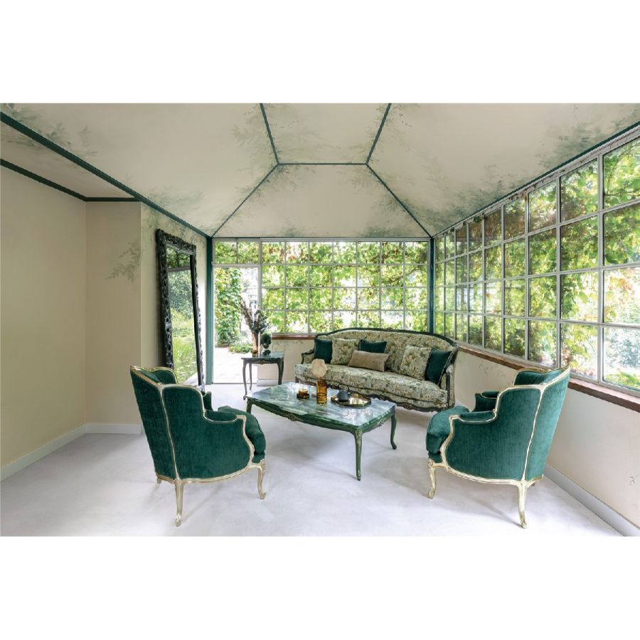 In a space where the color theme is Lotus green, the furniture creates a harmonious blend of elegance and style. The embroidered three-seater sofa, paired with two solid-color armchairs, and a marble coffee table in the center, all reflect this soothing tone that beautifully balances the dominant Louis XV style. The armchair, crafted from intricately carved wood, is upholstered in luxurious fabric and finished with a Silver Gold leaf touch, enhancing its refined appearance. The cover is not removable, ensuring a seamless, sophisticated look.