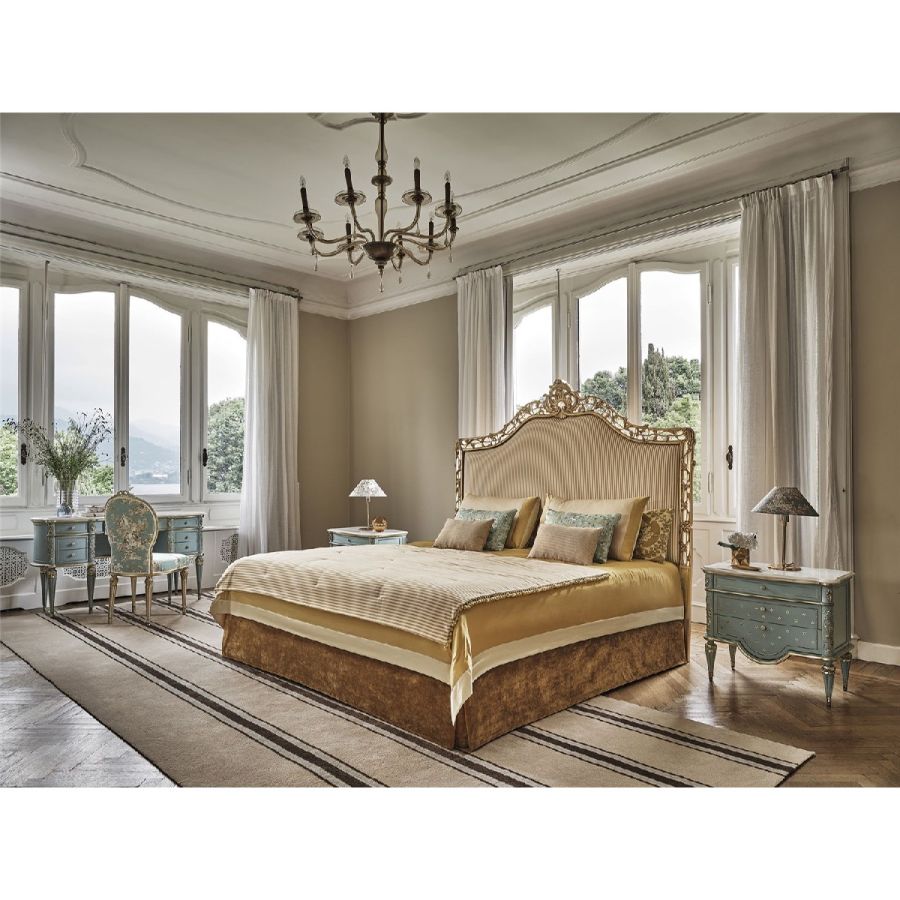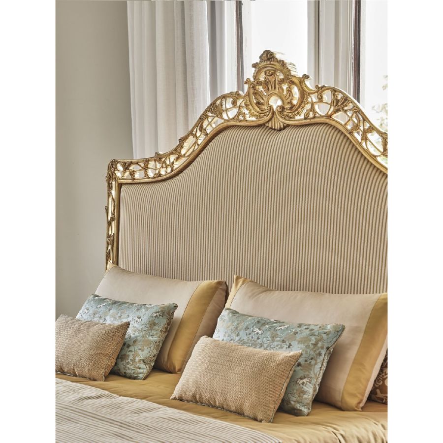 The bed features a carved wooden headboard, complemented by a fabric-upholstered panel and a luxurious Silver Gold leaf finish. A perfect blend of artistry and elegance, it promises to be the centerpiece of any bedroom.