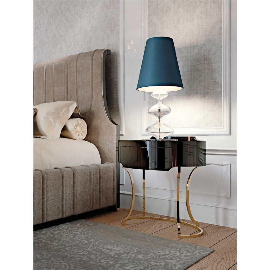 This night table, designed by Ezio Bellotti, is crafted from elegant ebony wood and features a luxurious Calacatta Gold marble top. The sleek design is complemented by a bright brass base, adding a touch of sophistication. The practical drawer provides convenient storage while enhancing the overall aesthetic of the piece.
