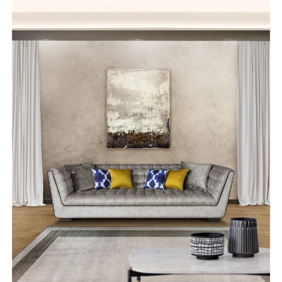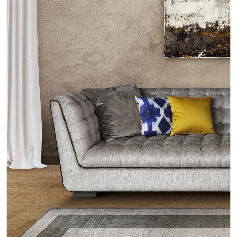 This three-seater sofa stands as a perfect example of luxurious craftsmanship. Upholstered in high-quality fabric, it is distinguished by elegant piping that enhances its sleek, refined profile. The inside features a beautifully worked capitonné design, offering both visual appeal and an added layer of comfort. This meticulous attention to detail ensures a timeless piece, perfect for a variety of interiors.