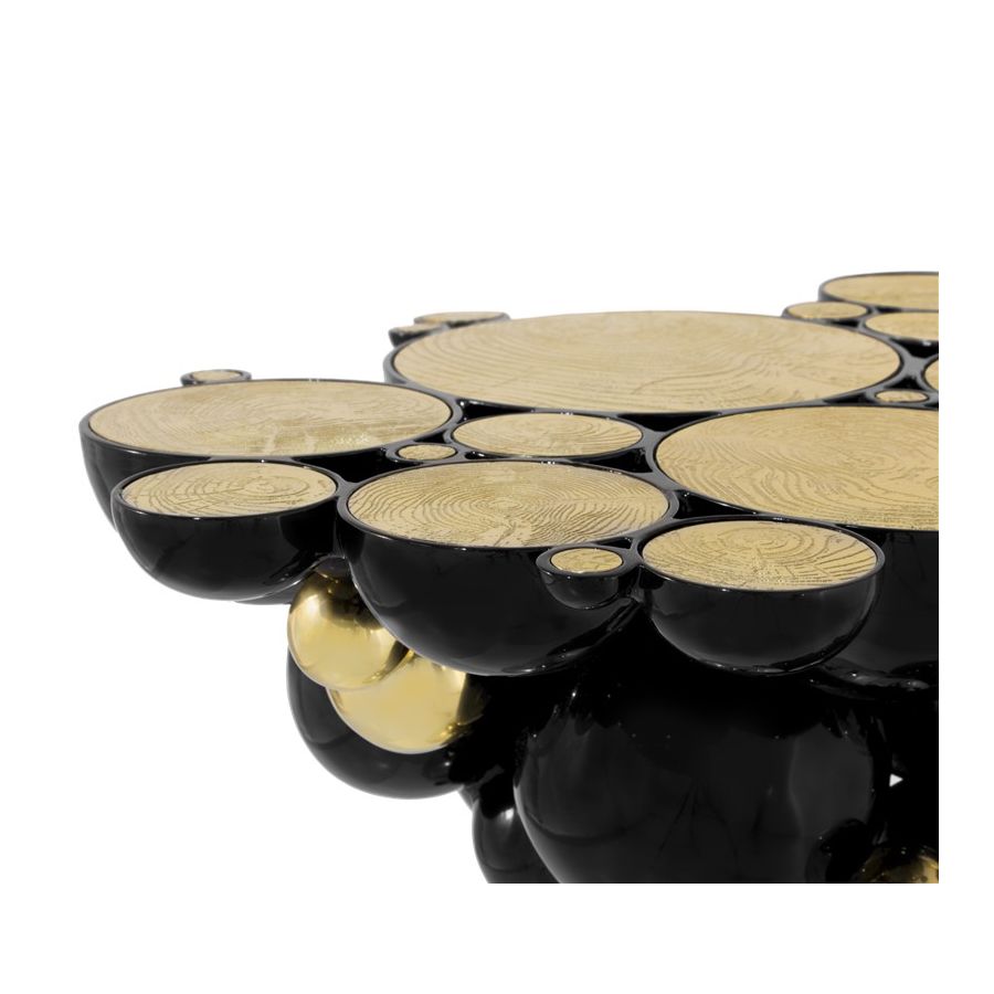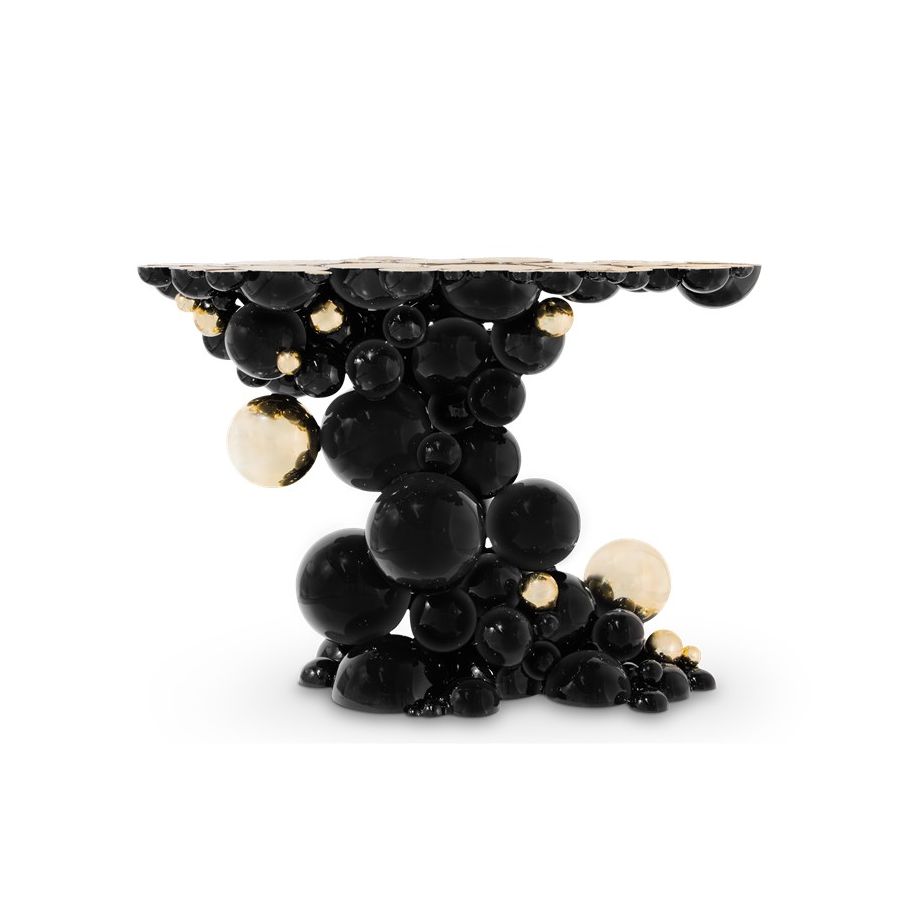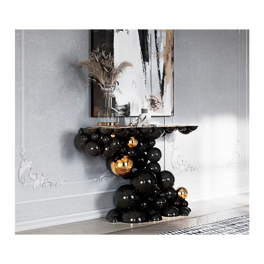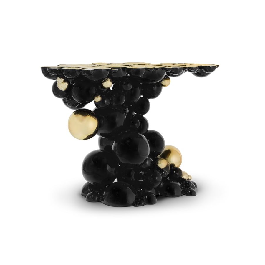 Defying the laws of physics, the Newton black and gold console has grown from the ancient art of casting metal, where metal is heated until molten into spheres and semi-spheres shape. One by one, each element is joint to produce an outstanding pattern and organic structure, finished in a dramatic black lacquer and gold plated accents. The top of this console table is composed of brass circles carved with a golden texture similar to organic wood texture. A contemporary console that carries cultural legacy while successfully moves towards the future, remaining ahead of the of the design scene. A real expression of exclusivity and high collectible craftsmanship outcome.