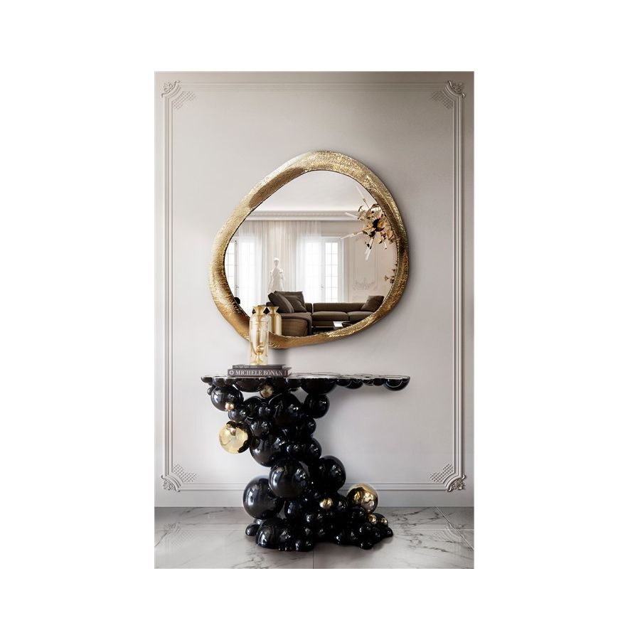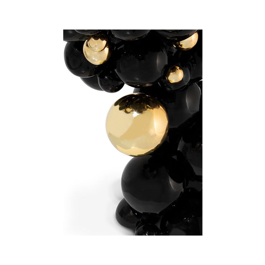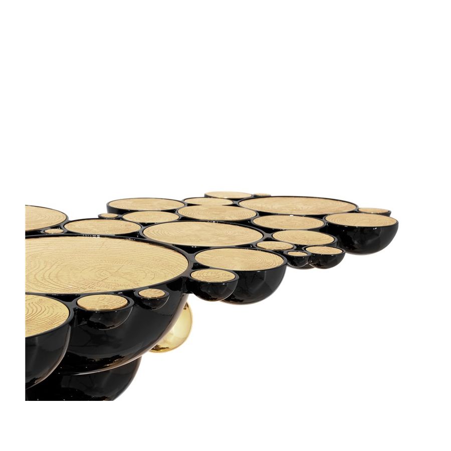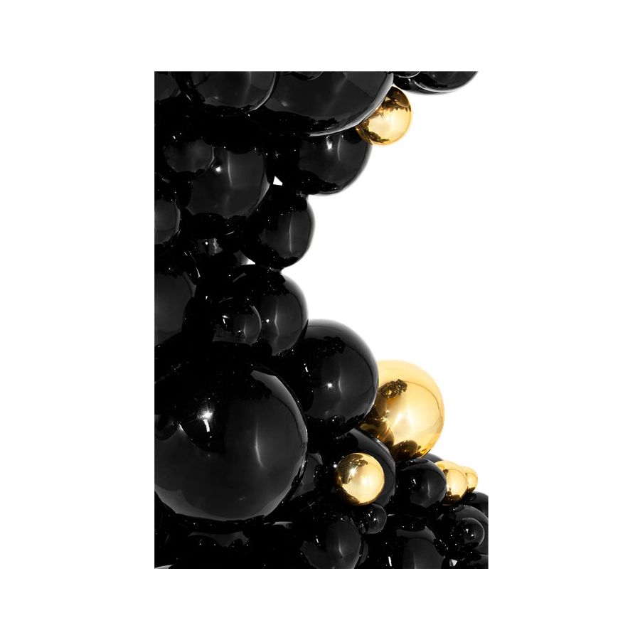 Defying the laws of physics, the Newton black and gold console has grown from the ancient art of casting metal, where metal is heated until molten into spheres and semi-spheres shape. One by one, each element is joint to produce an outstanding pattern and organic structure, finished in a dramatic black lacquer and gold plated accents. The top of this console table is composed of brass circles carved with a golden texture similar to organic wood texture. A contemporary console that carries cultural legacy while successfully moves towards the future, remaining ahead of the of the design scene. A real expression of exclusivity and high collectible craftsmanship outcome.