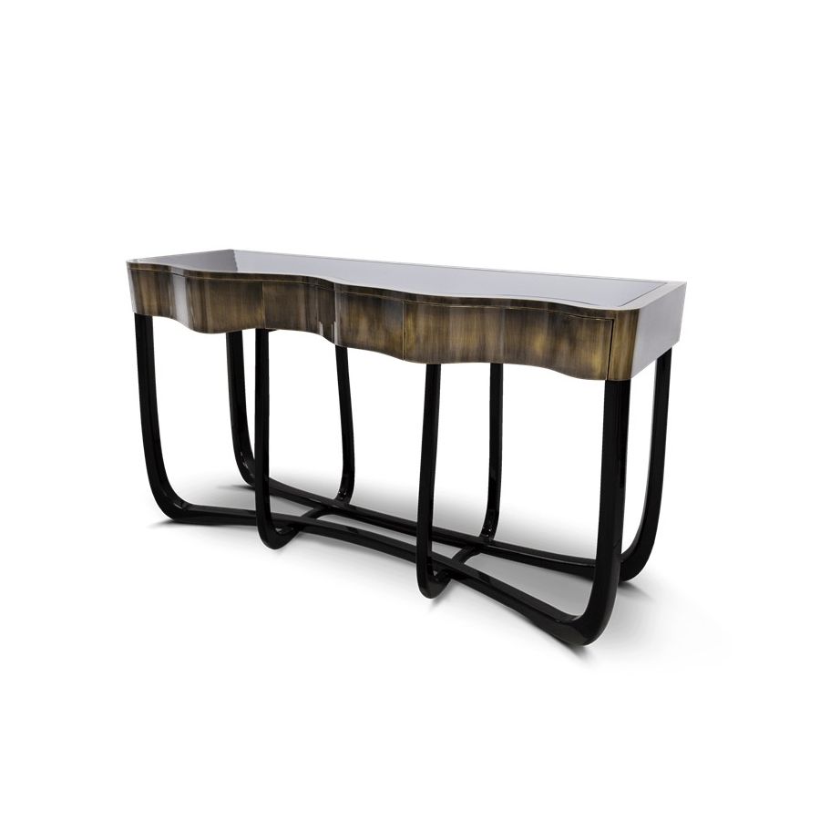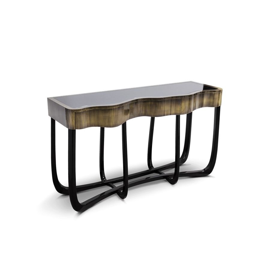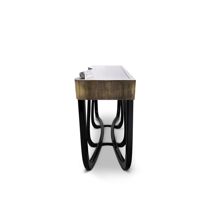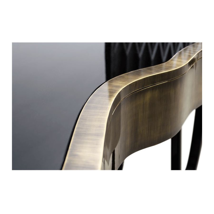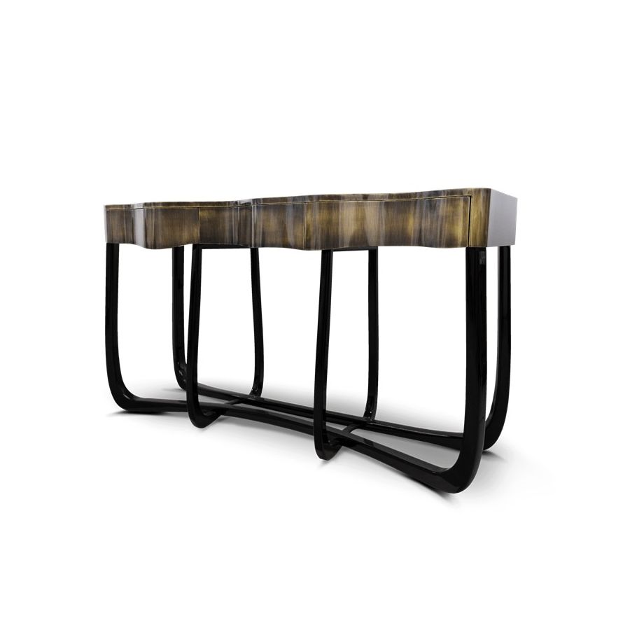 With Sinuous Patina Console you will successfully create a luxurious environment. Sinuous is made for those who love harmonious lines mixed with exquisite detail. Its design is seductive and lures you into a magical and golden world. To achieve extravagance, Boca do Lobo’s artisans handcrafted the structure in mahogany with a high gloss black lacquer finish and top coated in polished brass plated, bringing up the vivid and bright side of Boca do Lobo. This luxury furniture design contains three drawers, adding function to the unique piece.