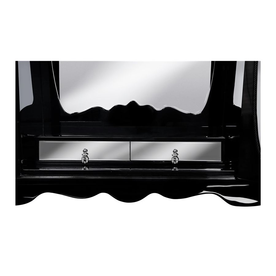 Composed by mahogany and clear glass in the front and laterals. Contains two shelves in smoked glass. It is opened through a frontal door by closing switch. In its interior, the back is lined with smoked mirror and contains two drawers and polished brass handles.