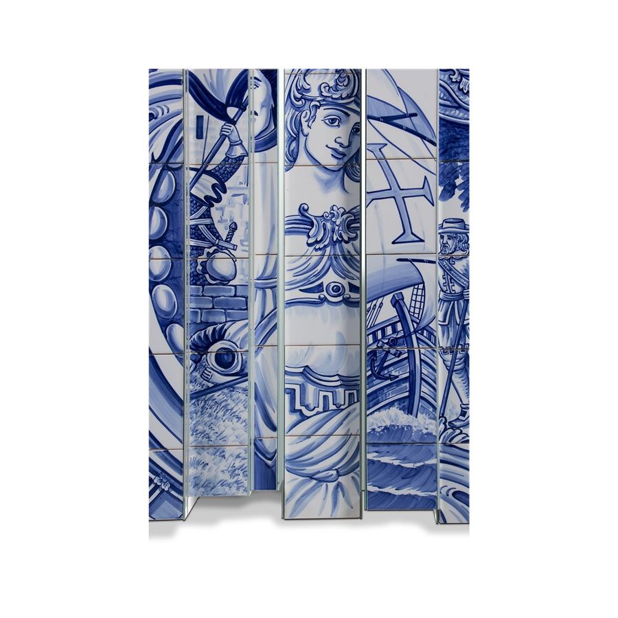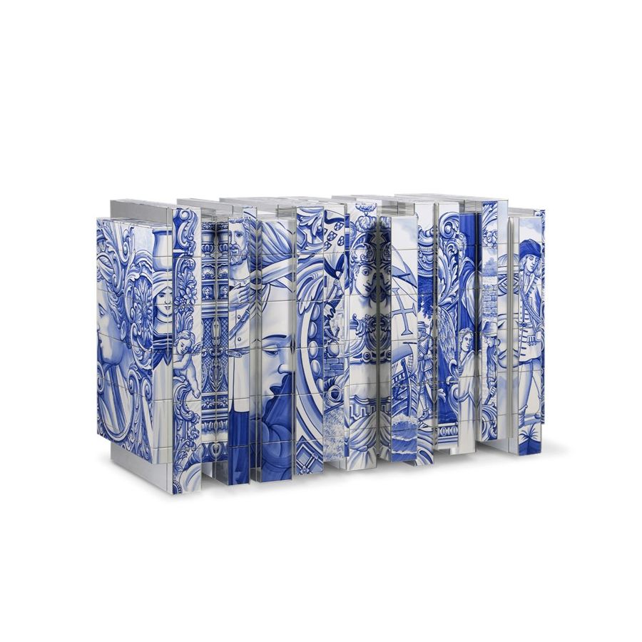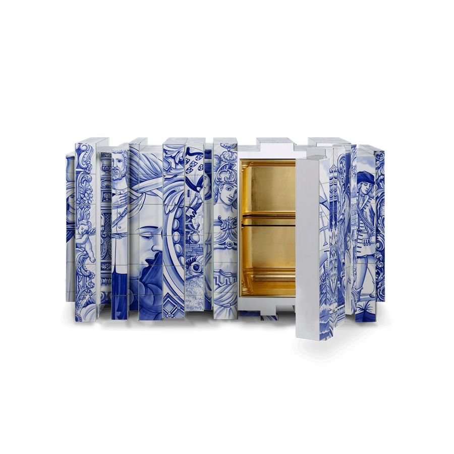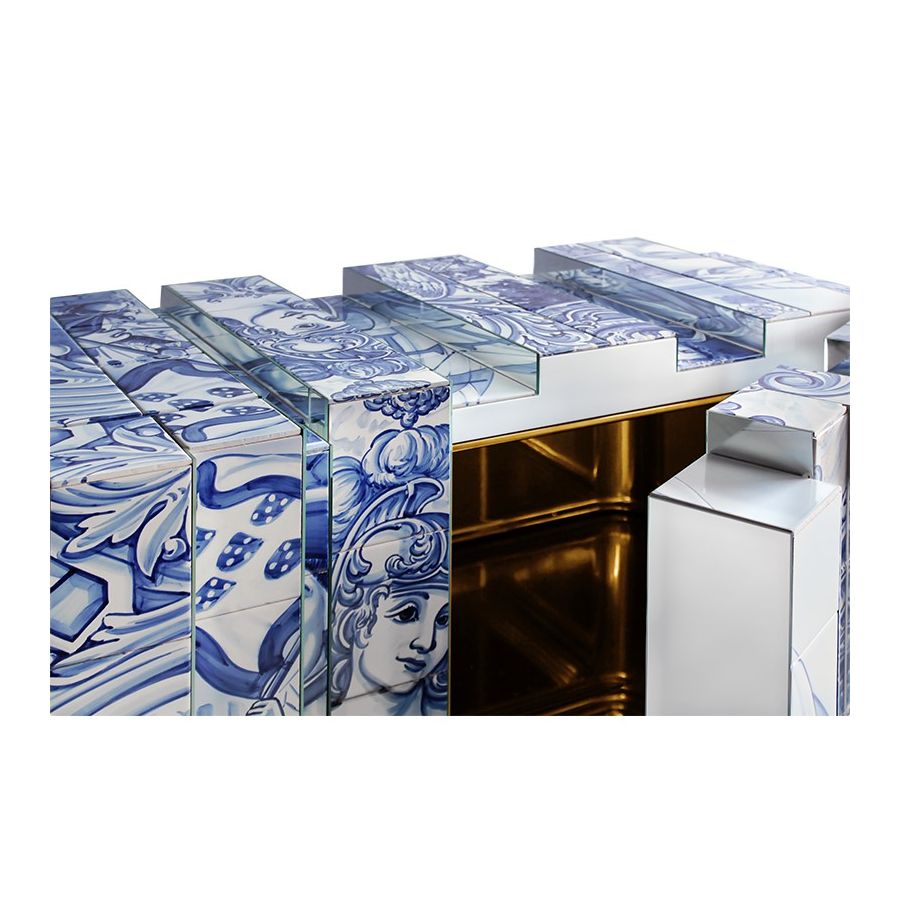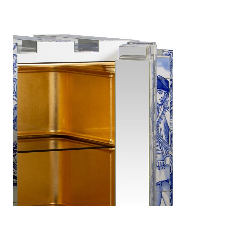 The Heritage Sideboard is a magnificent journey through Portuguese legacy. Covered in Azulejos, traditional hand painted tiles and one of the most representative art forms of Portuguese culture, the architectural sideboard portrays different scenes from the country’s Discoveries era. Centuries of history are gathered in a single final panel, and each layer is enhanced by vertical mirrors on the lateral surfaces. The hint of wander through the rich legacy continues when two door open to a lined glossy gold leaf interior, and a classical ornament trim reminds the inside of churches and rich buildings. A clear glass shelve can be seen on the two individual divisions of the sideboard. A statement sideboard, the Heritage can take center stage in the most elegant rooms since its back is also fully hand painted. A lengthy tradition of bespoke and exclusivity to make one-of-kind design pieces.