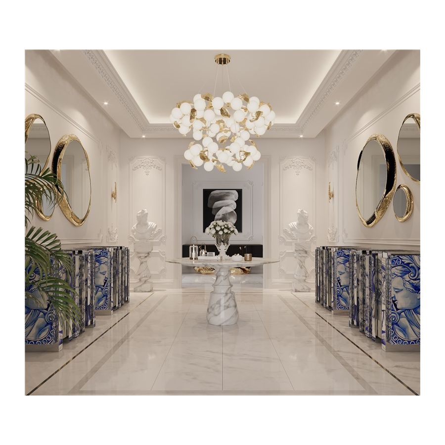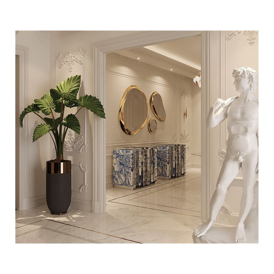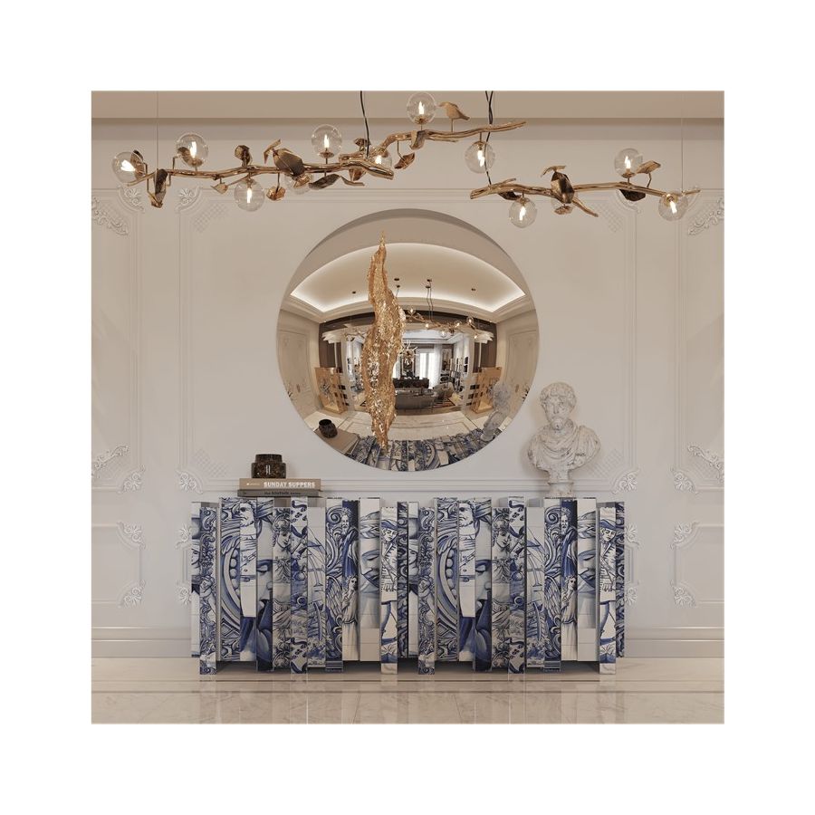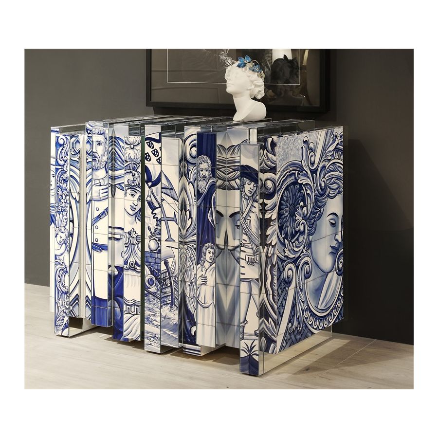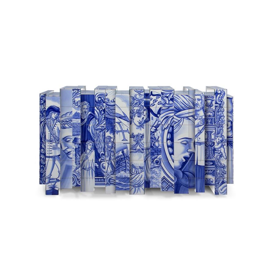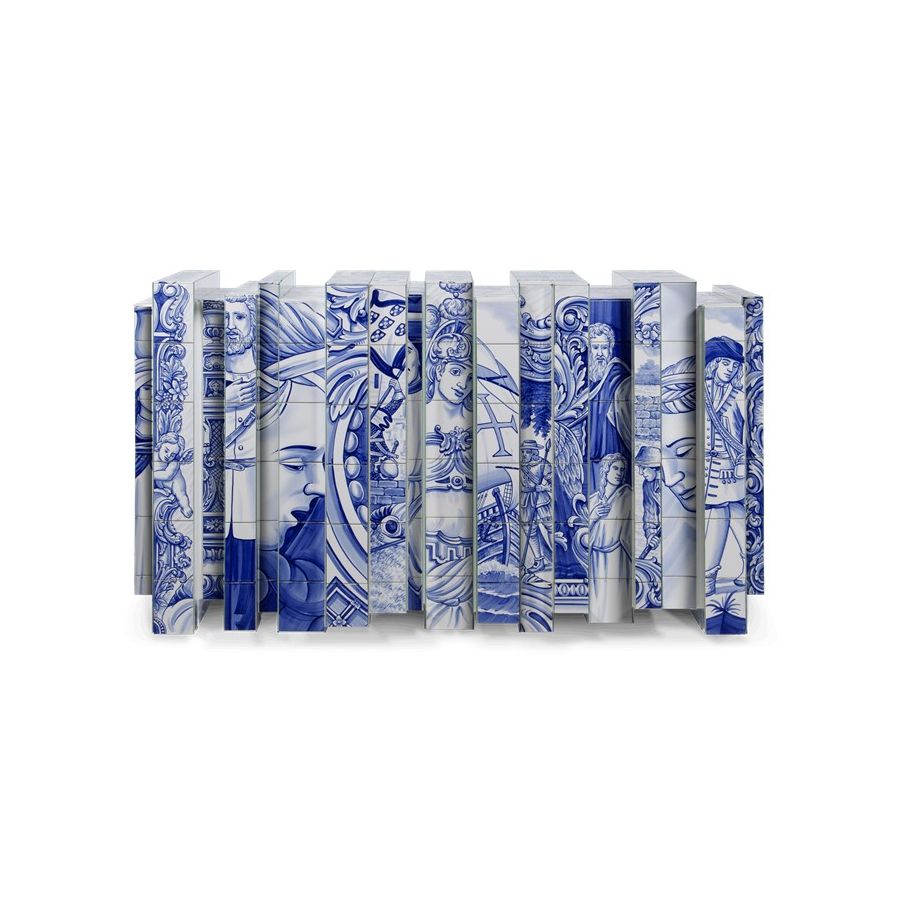 The Heritage Sideboard is a magnificent journey through Portuguese legacy. Covered in Azulejos, traditional hand painted tiles and one of the most representative art forms of Portuguese culture, the architectural sideboard portrays different scenes from the country’s Discoveries era. Centuries of history are gathered in a single final panel, and each layer is enhanced by vertical mirrors on the lateral surfaces. The hint of wander through the rich legacy continues when two door open to a lined glossy gold leaf interior, and a classical ornament trim reminds the inside of churches and rich buildings. A clear glass shelve can be seen on the two individual divisions of the sideboard. A statement sideboard, the Heritage can take center stage in the most elegant rooms since its back is also fully hand painted. A lengthy tradition of bespoke and exclusivity to make one-of-kind design pieces.