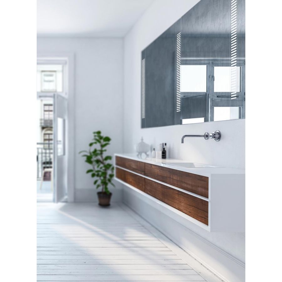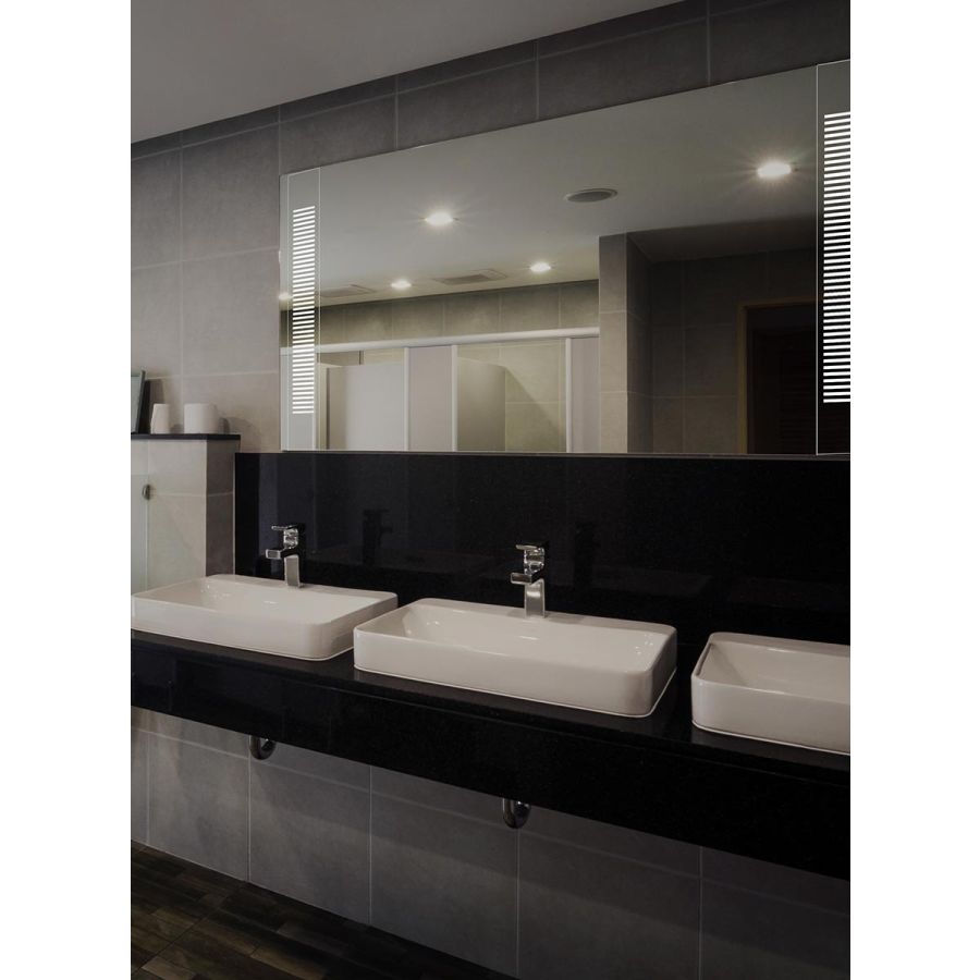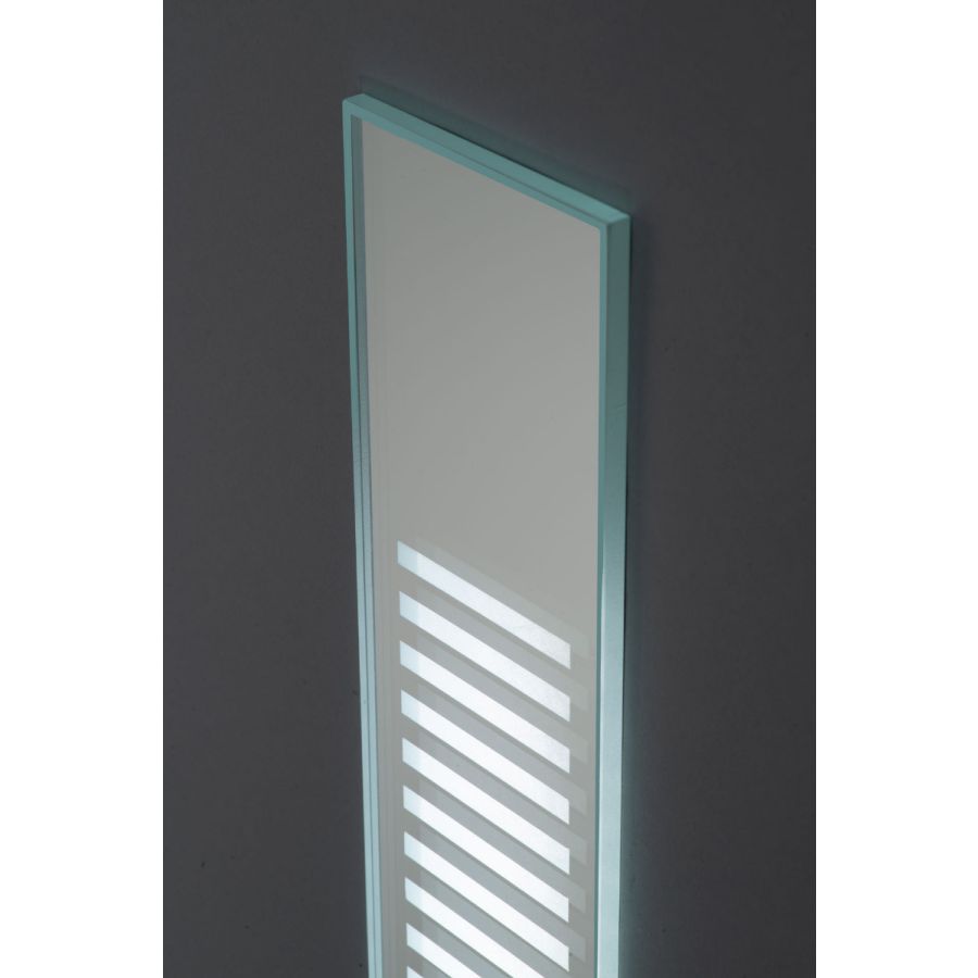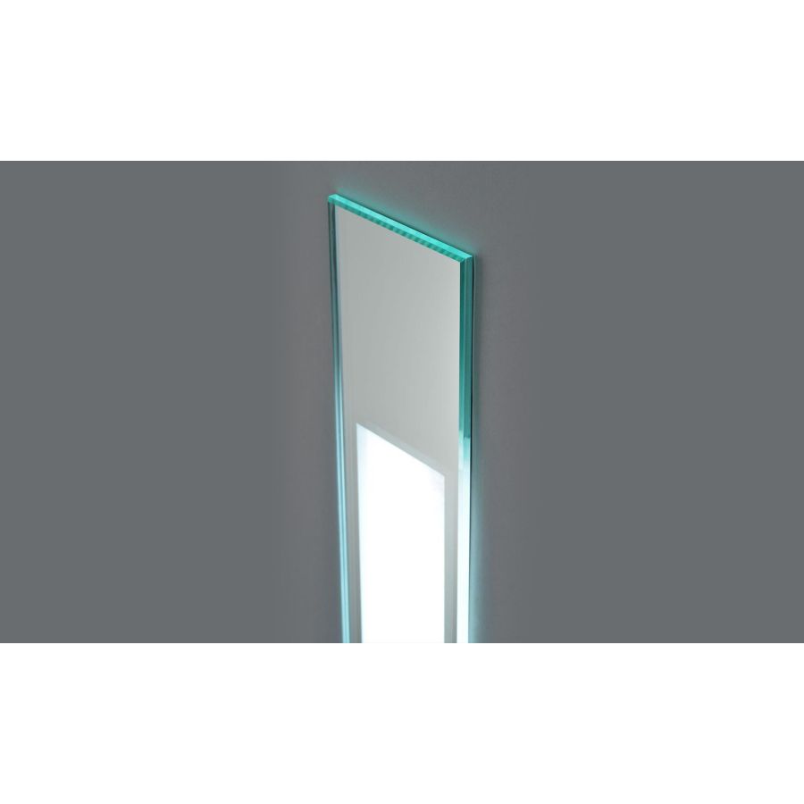 The Emanation LED Mirrored In-Wall provides punctuations of visible light on any custom mirror. To illuminate ones’ face, filtered, non-glare light glows through a three-inch-wide mirrored faceplate on which there is an etched pattern. It is recessed mounted to be flush with the surrounding mirror for uninterrupted reflection.