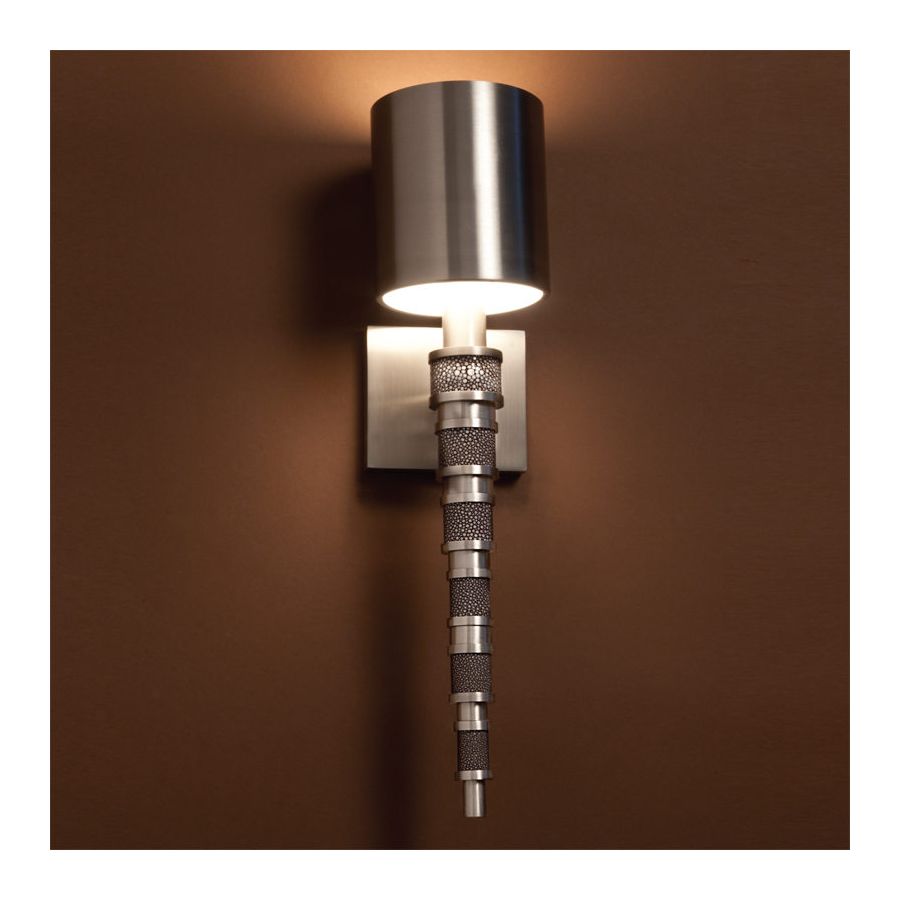 This customizable sconce is available in six metal finish options, with hubs available in one of five shagreen color options or one of three wood finish options.