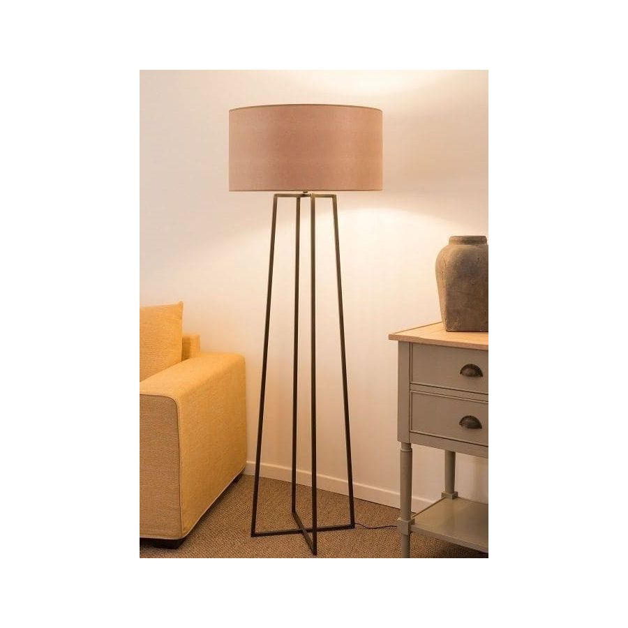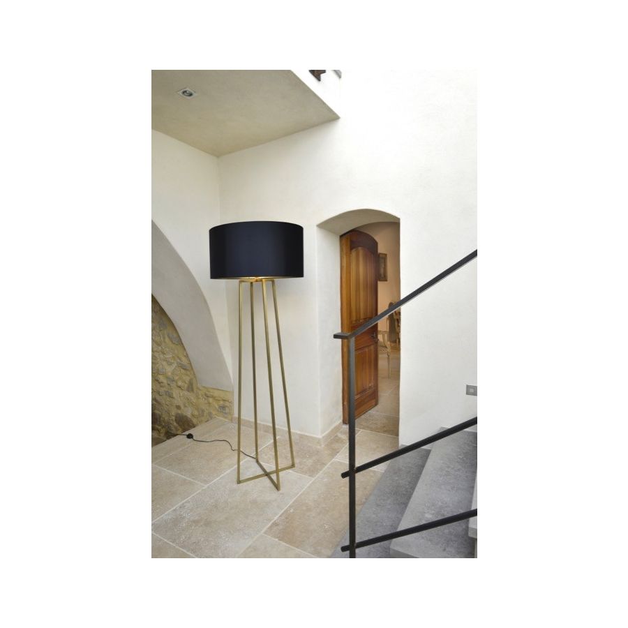 Floor lamp in brass. Made with 4 inclined square tubes, joined at their end by 2 crossed tubes. This contemporary floor lamp gives an original design to your interior. Available in black or matt gold patina. Presented lamp shade in beige striated chintz in a cylindrical upright shape (see other available shapes and colours).