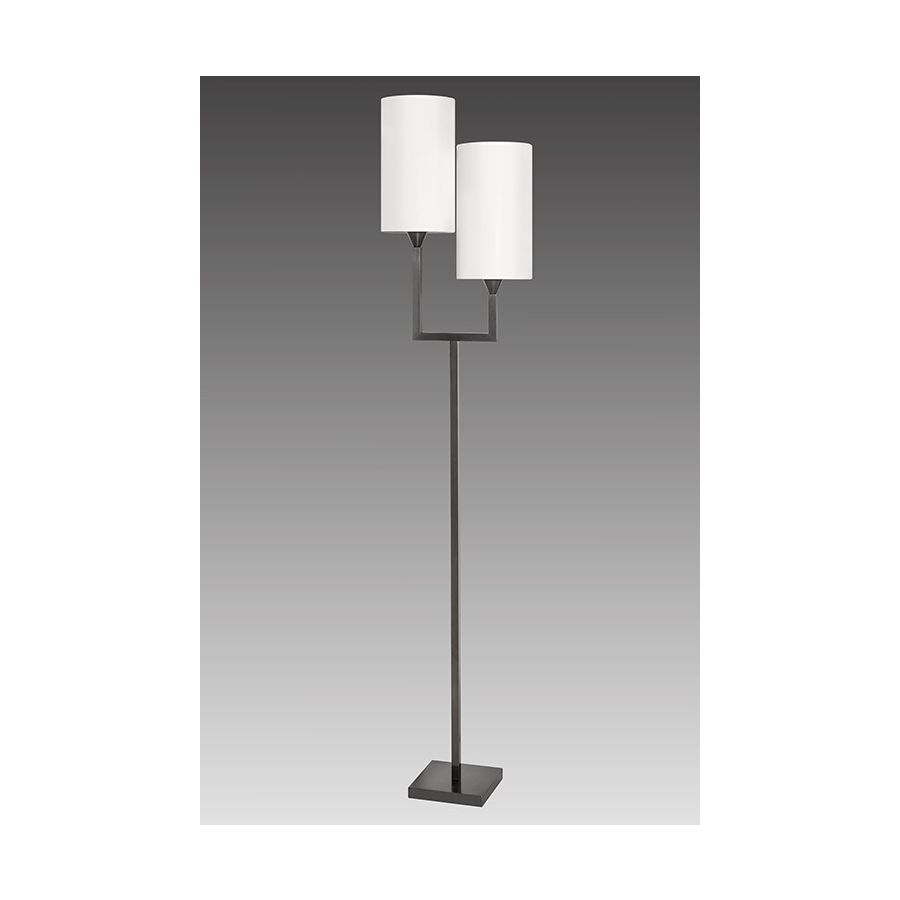 Floor lamp made in brass. Made with a square tube as a double torch on a square base. This contemporary floor lamp gives an elegant design to your interior. Available in black patina. Presented lamp shade in white cotton chintz in rectangular shape (see other available shapes and colours).