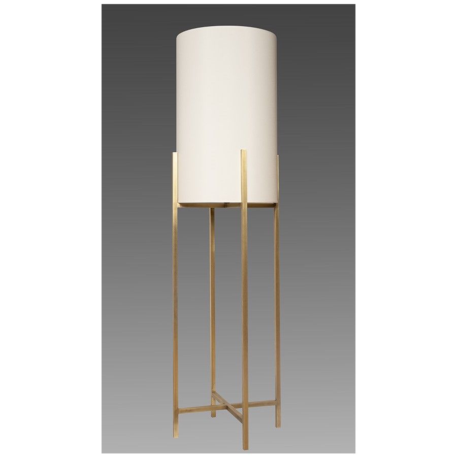 Floor lamp in brass. Made with 4 vertical square tubes, joined in their middle by 2 crossed tubes. This contemporary floor lamp gives an original design to your interior. Available in black or matt gold patina. Presented lamp shade in white cotton chintz in a cylindrical shape (see other available colours).