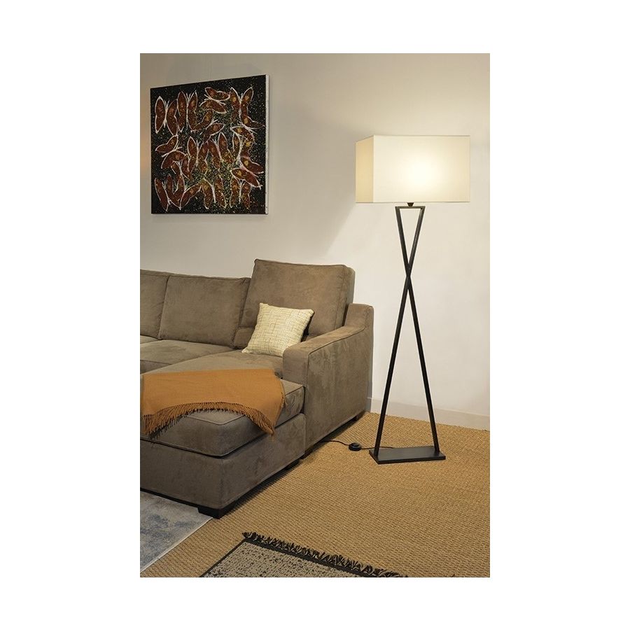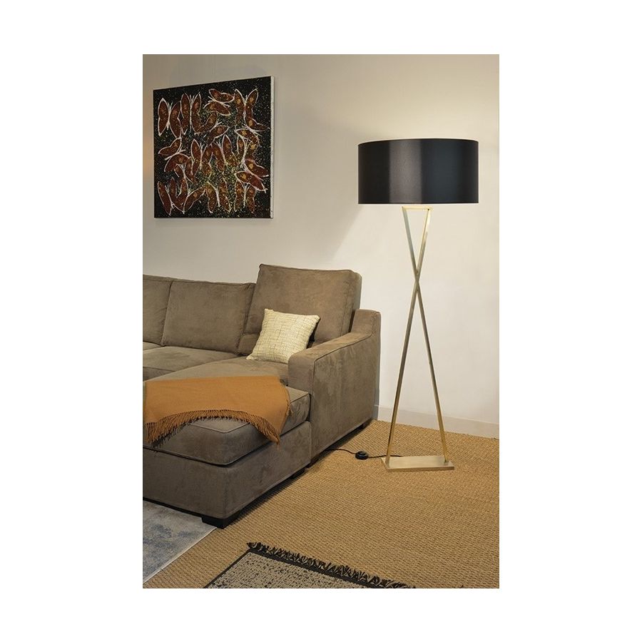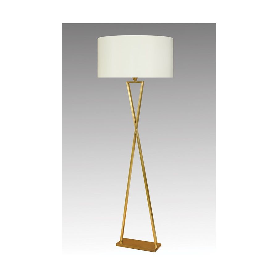 Floor lamp made in brass. Made with 2 rectangular tubes making triangles on a rectangular base. This floor lamp with an original and elegant geometric design will bring a touch of modernism in your interior. Available in black or matt gold patina. This model is also available in table lamp (L196) and in wall light (AL196). Presented lamp shade in white cream chintz in a cylindrical shape (see other available shapes and colours).