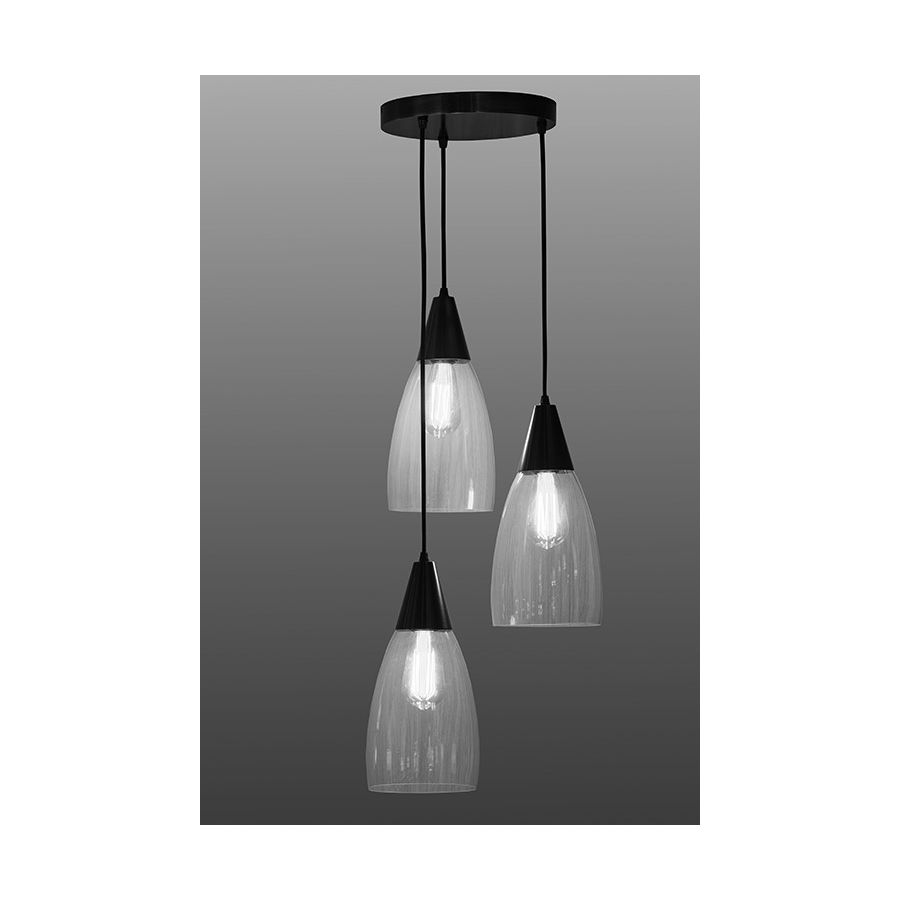 Light made in brass. Made with 3 cables fixed to the ceiling with a round base, and with a glass globe at their end. Lighting is made with a filament bulb. This contemporary suspension gives an original design and a warm ambiance to your interior. Available in black patina