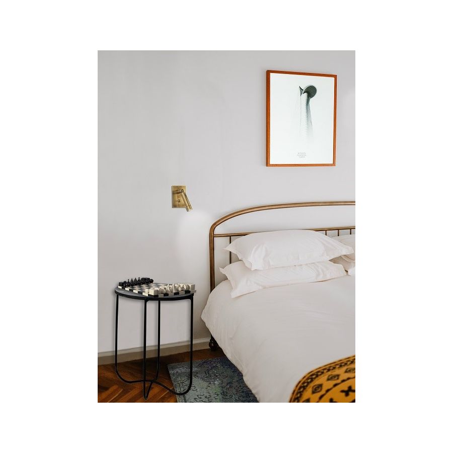 Wall light with Led light made in brass. Made with a led head fixed with a rotating kneecap, on an embedded rectangular plate with switch. This reading wall light gives a sober and elegant design, and an efficient direct light. Available in black or matt gold patina, and in nickel or brushed nickel.