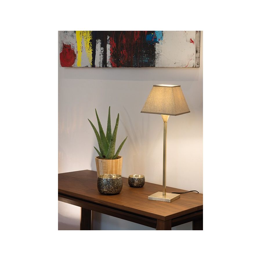 Lamp made in brass. Made with a square tube on a square base. This contemporary lamp gives a touch of discrete elegance to your interior. Available in black or matt gold patina, and in nickel or brushed nickel. Also exists in small (L122A) or in large size (L122C). Presented lamp shade in white cotton chintz in a pyramidal tapered shape (see other available shapes and colours).