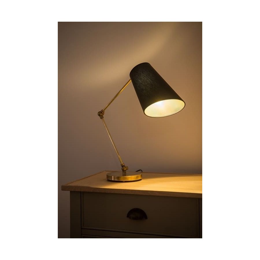 Lamp made in brass. Made with a double swing round tube on a round base. This lamp with an original design gives a changing light thanks to its swing arm. Available in black or matt gold patina. Presented lamp shade in black chintz with gold inside in a conical shape (see other available shapes and colours).