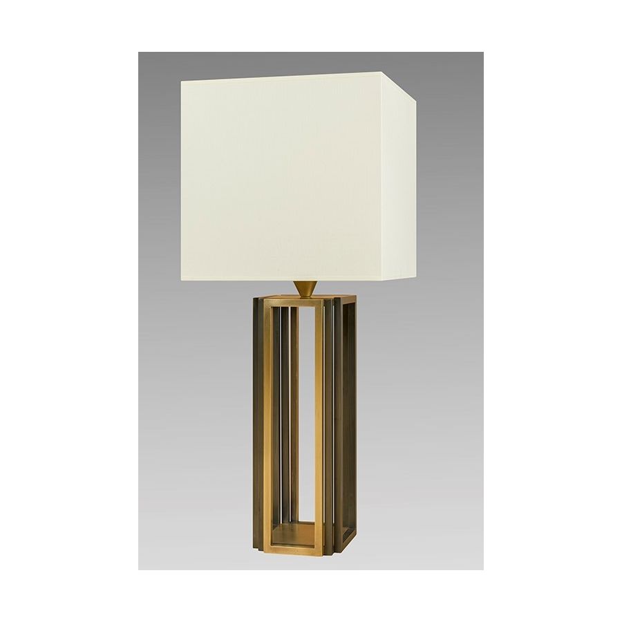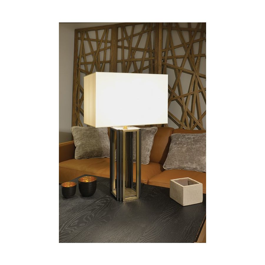 Table lamp made in brass. It is made with 4 sides, each with bicolor layered rectangles. This lamp, which is definitely contemporary and represents a wonderful sculpture work, magnificently decorates your interior. AVailable in bicolor black and matt gold patina. Presented lamp shade in white cotton chintz in a square shape (see other shapes and other available colours).