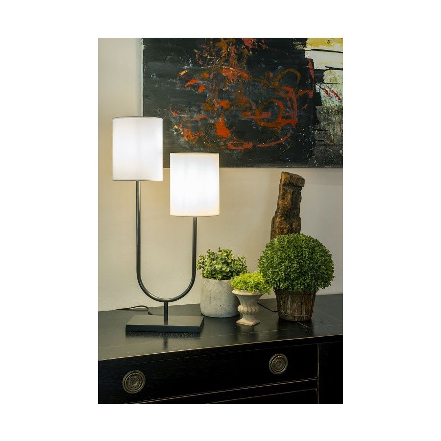 Lamp made in brass Made with a U shape round tube on a rectangular base This contemporary lamp gives an elegant design to your interior, in a living room or a bedroom Available in black or matt gold patina Presented lamp shade in white cotton chintz in cylindrical shape (see other available colours).