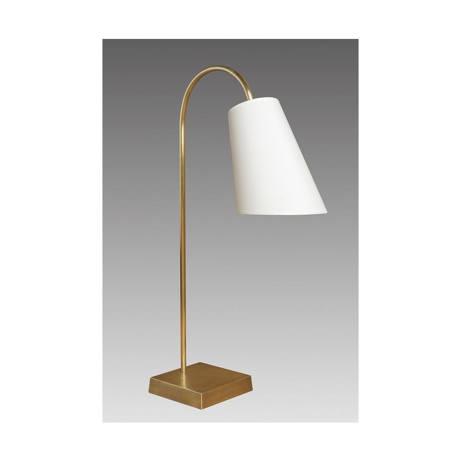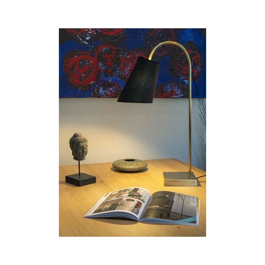 Lamp made in brass Made with a curved round tube on a round base This contemporary, with a classical touch, lamp is perfect for your ambiance or reading in a living room, a bedroom or in an office Available on black or matt gold patina Presented lamp shade in white cream cotton chintz in a conic shape (see other available colours).