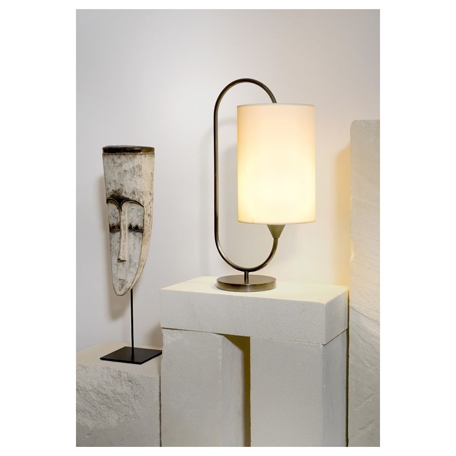 Lamp made in brass It is made with a round tube showing an elegant oval which encloses the lamp shade, on a round base This lamp with a nice design decorates with elegance a living room, a bedroom or an office Available in black or matt gold patina Presented cylindrical shade in white cream chintz (see other available colors).