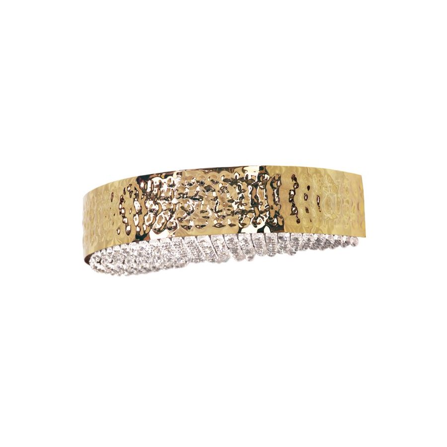 Złocona mosiężna konstrukcja jest kuta rękami doświadczonych rzemieślników projektujących oświetlenie, a piękne, delikatne kryształy są również indywidualnie montowane ręcznie u dołu kinkietu. Niech ten efektowny kinkiet zainspiruje Twoje projekty, tworząc najbardziej wyrafinowane i eleganckie aranżacje.