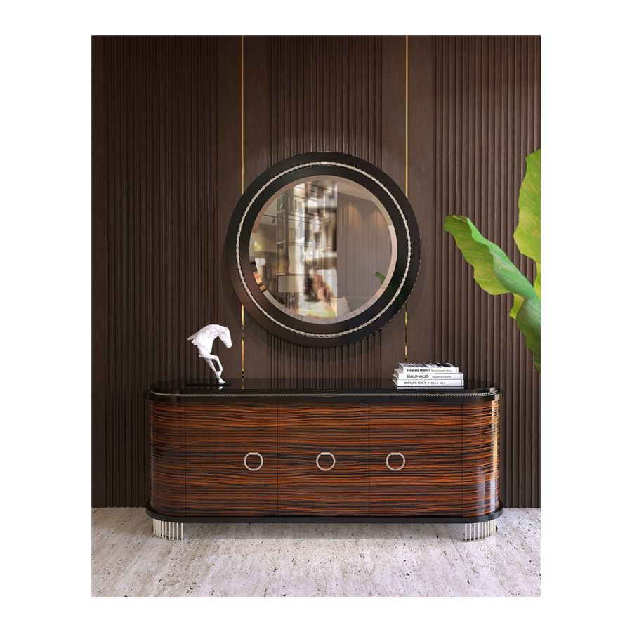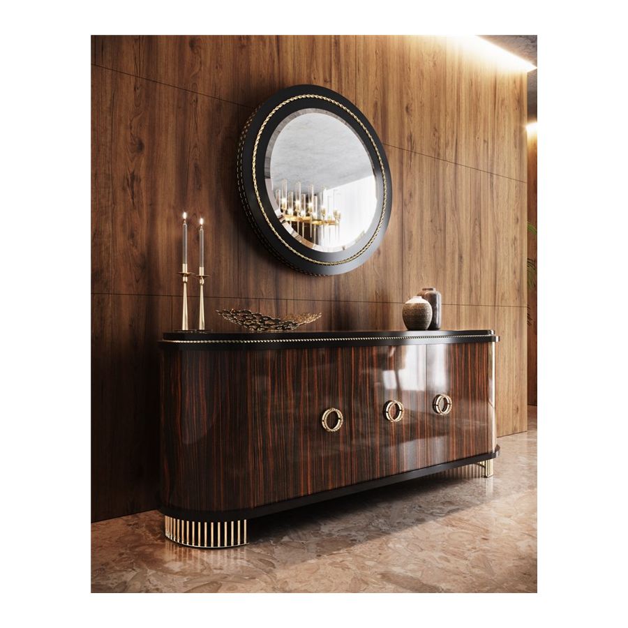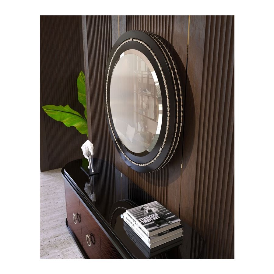 Ten mebel został zaprojektowany, aby imponować unikalnym, awangardowym, a jednocześnie eleganckim wzornictwem, mając w swoim rdzeniu nowoczesny akcent. Lustro Nautilus składa się ze starannie dobranych materiałów premium, takich jak drewno i mosiądz, wykończonych czarnym lakierem w wysokim połysku. Lustro ma konstrukcję z forniru hebanowego, uzupełnioną smukłymi liniami z mosiądzu, co podkreśla silny męski charakter tego projektu. Jest to przyciągający wzrok element wyposażenia, gdyż ten element wystroju mistrzowsko odzwierciedla piękno rzemiosła zastosowanego w jego produkcji.