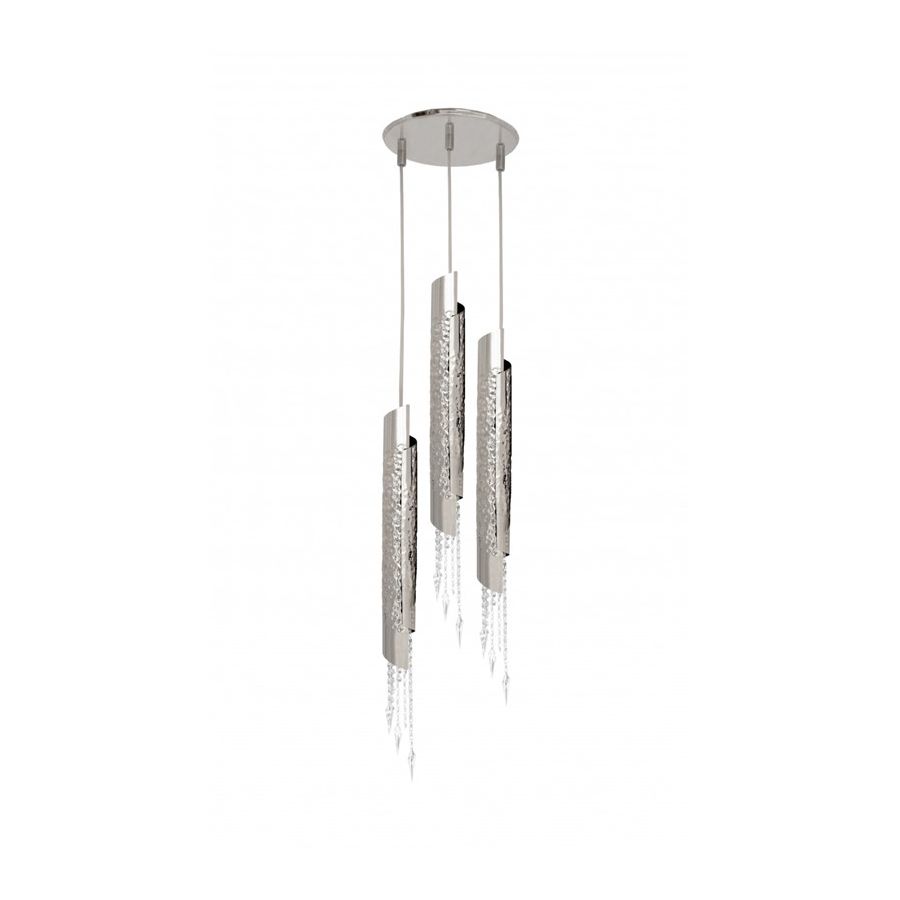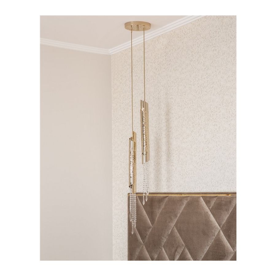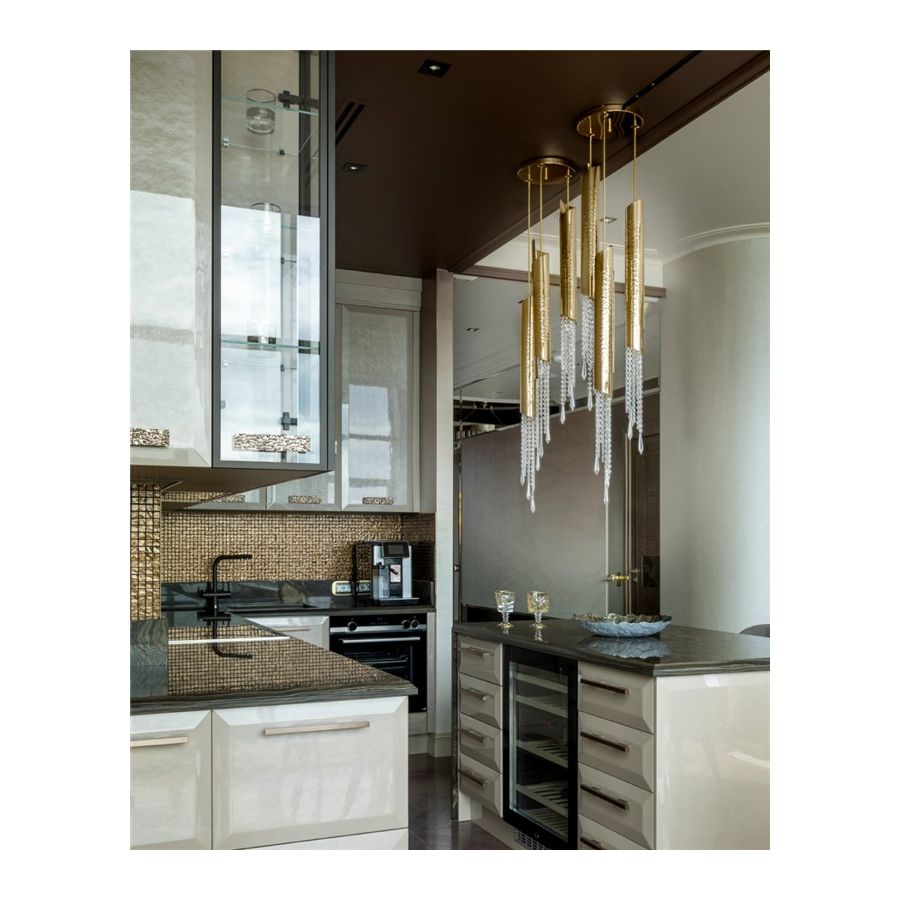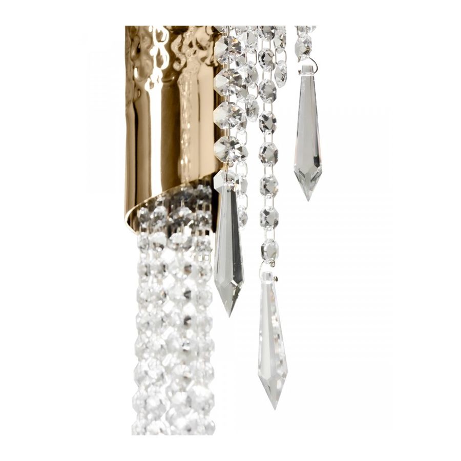 Rury z mosiądzu pozłacane 24k złotem są młotkowane przez ręce doświadczonych rzemieślników i ozdabiane delikatnymi kryształami, starannie montowanymi jeden po drugim przez producentów oświetlenia. Fakt ten, w połączeniu z możliwością personalizacji światła w licznych konfiguracjach, nadaje każdemu projektowi ekskluzywną osobowość.