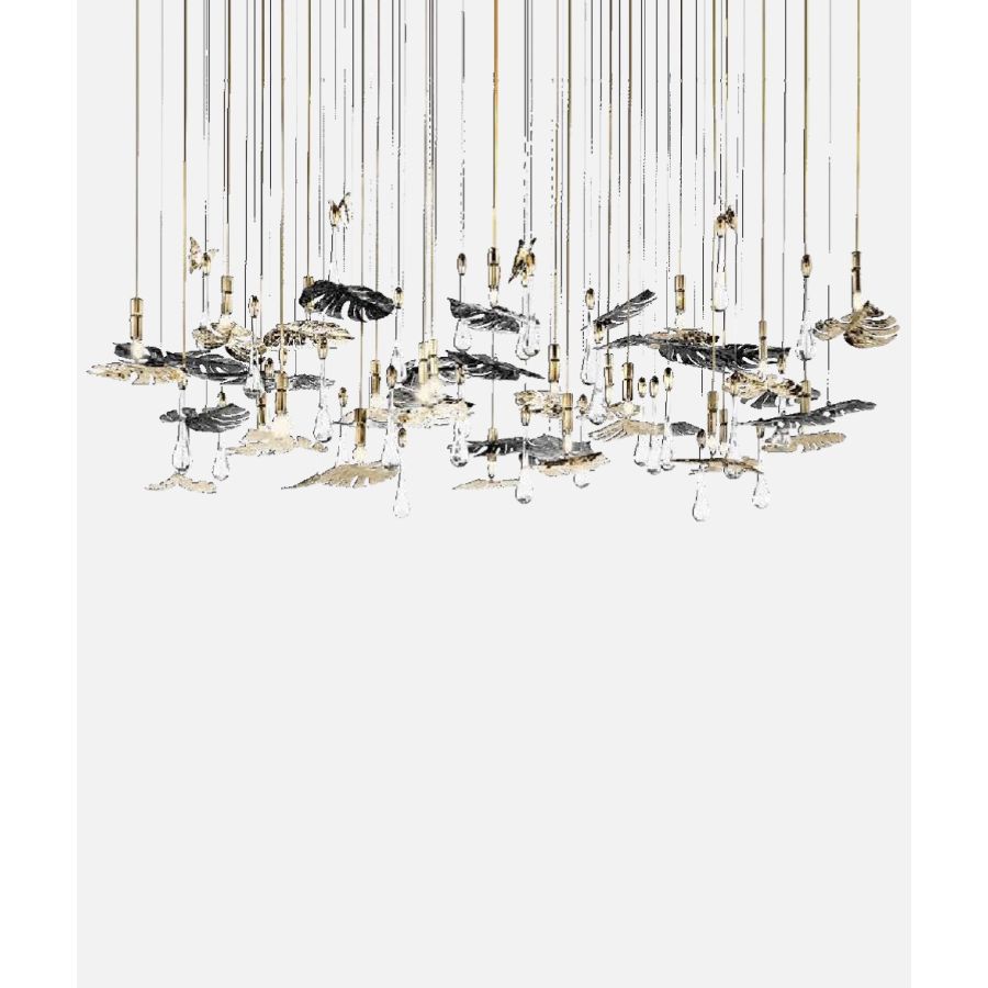 The Rainforest Collection arose from the timeless lighting celebration of nature silhouettes, its elements, and movements. Immerse yourself in the magnificent atmosphere of the sparkling Rainforest where the art of brass craftsmanship becomes luxury lighting design. The ultimate fusion between artistic design, the authenticity of traditional portuguese metal-work techniques, and creative craftsmanship. Rainforest Suspension is unparalleled in the refinement and grace it represents, owing to the gold-plated brass coupled with hand-applied clear crystal glass that confers a delicate charisma to the piece. Adorned with falling raindrops and butterflies, it takes you to remote spaces and the open sky.