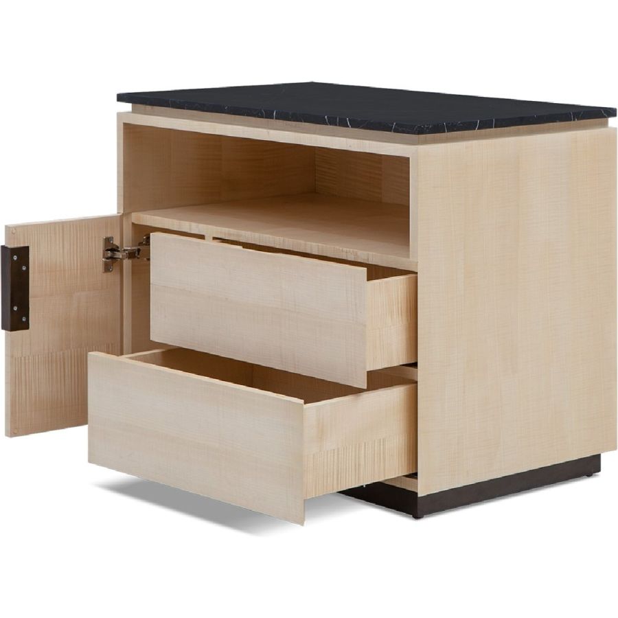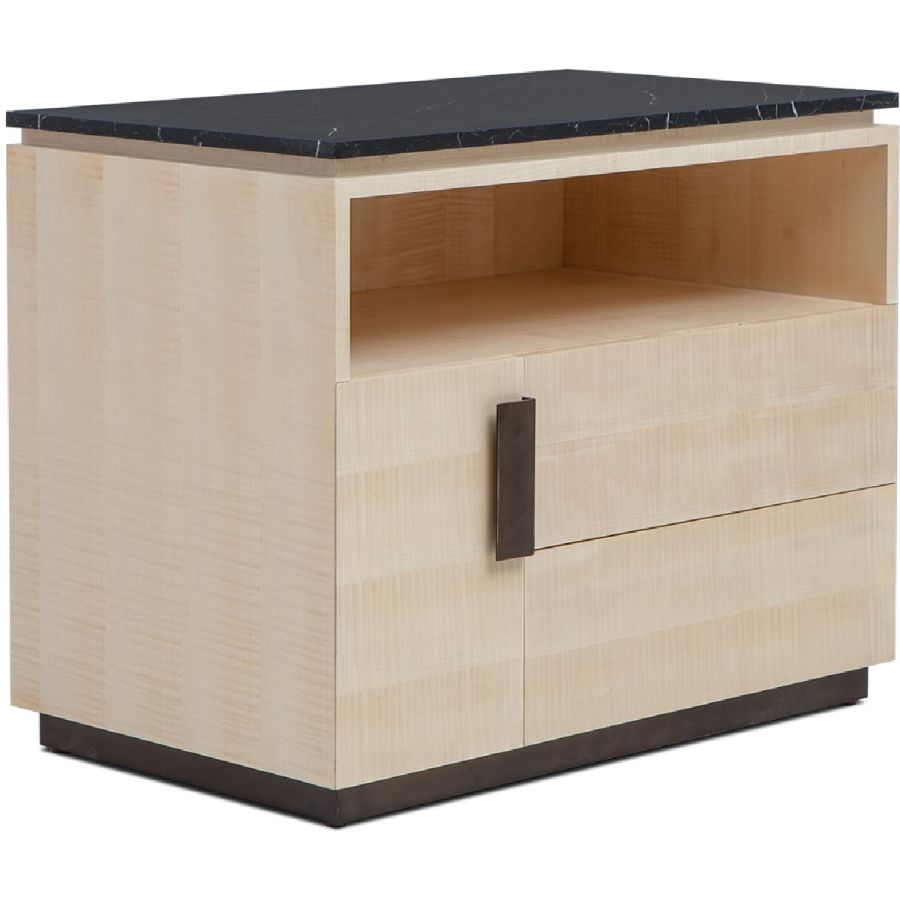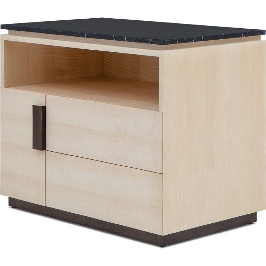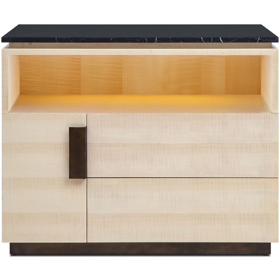 A stunning nightstand with contemporary styling. Hand crafted with an asymmetrical side-opening door, two drawers and a backlit shelf compartment, this striking piece also features an inset base and Nero Marquina Marble top.