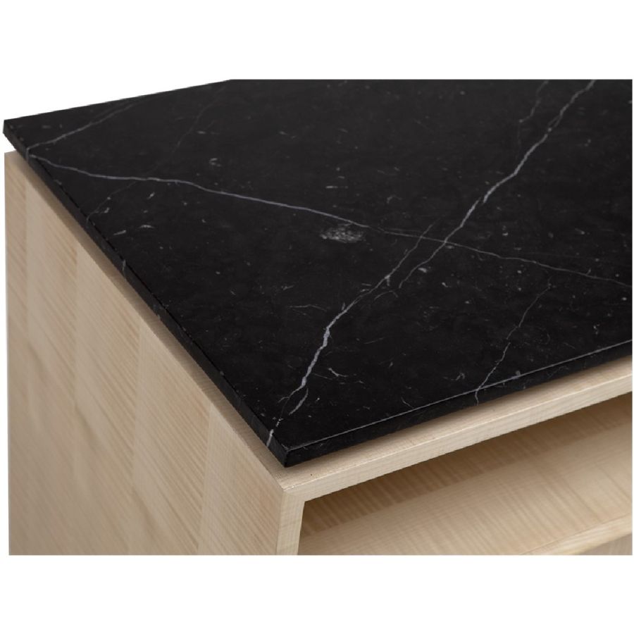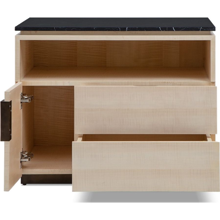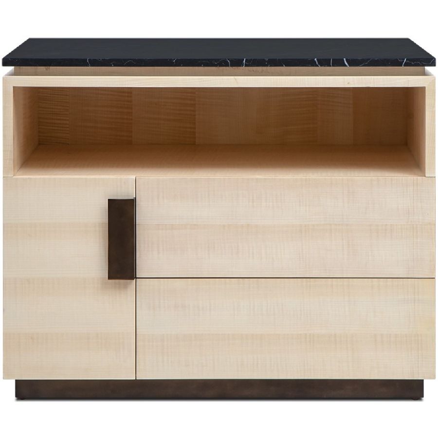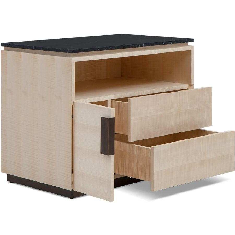 A stunning nightstand with contemporary styling. Hand crafted with an asymmetrical side-opening door, two drawers and a backlit shelf compartment, this striking piece also features an inset base and Nero Marquina Marble top.