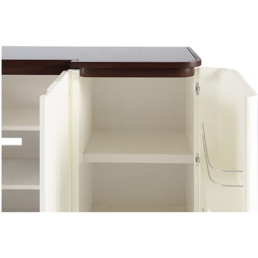 The two softly fluted hand carved front doors of this beautiful yet practical sideboard open to reveal three sections, one with adjustable shelves and two with fixed height shelving equipped with useful cable holes. A black glass top gives the piece an elegance and freshly modern feel.