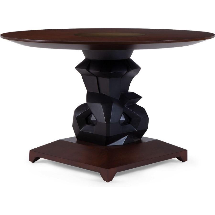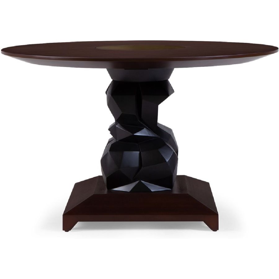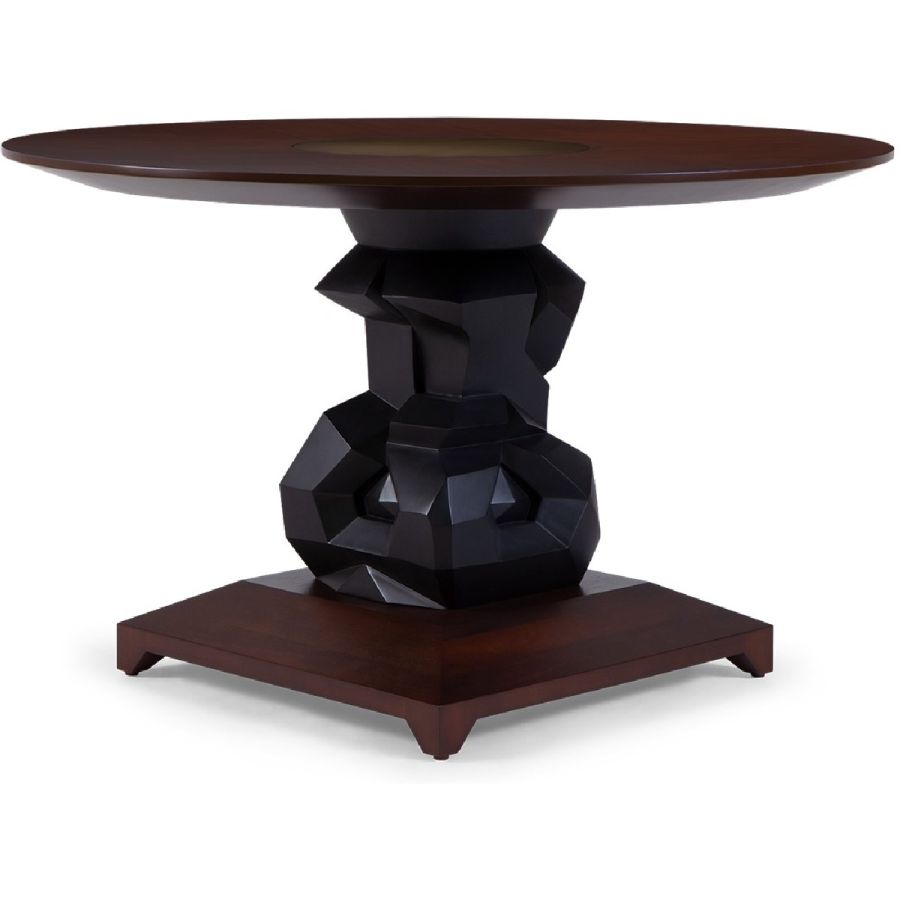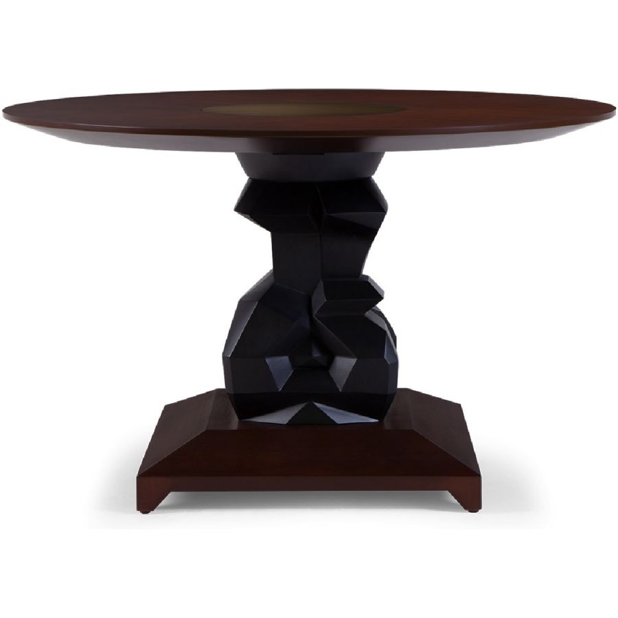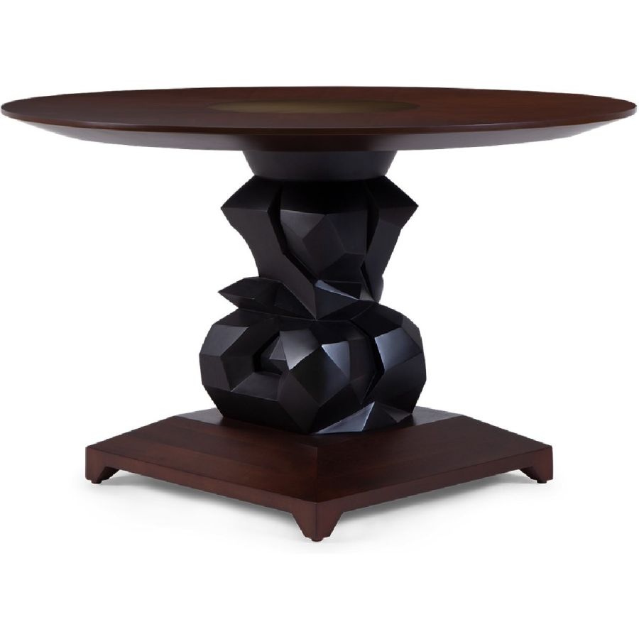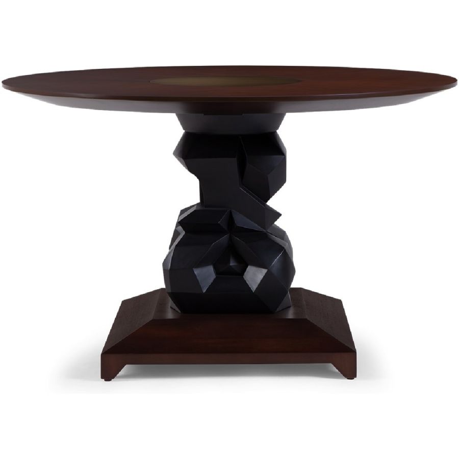 An imposing circular dining table design with hand-sculpted mahogany bases crafted into polyhedron shapes for a spectacular statement piece. The tabletop is expertly joined as four quarters, displaying the beauty of the wood grain.