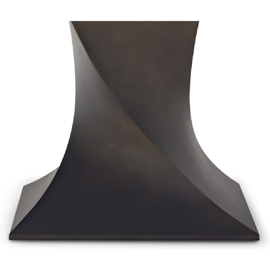 Contemporary living with a twist, this circular dining table features a twisted pedestal that protrudes through the veneered surface. The chiseled base is offered in a fabulous bronzed finish.