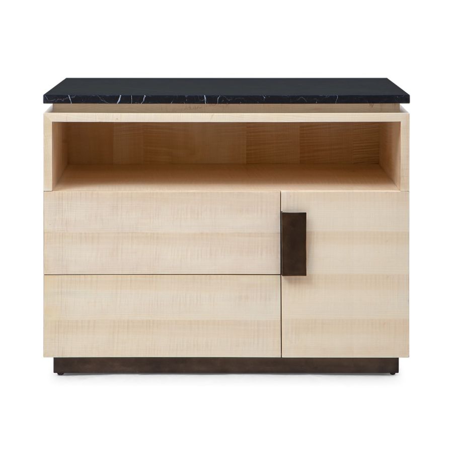 A stunning nightstand with contemporary styling. Hand crafted with an asymmetrical side-opening door, two drawers and a backlit shelf compartment, this striking piece also features an inset base and Nero Marquina Marble top.
