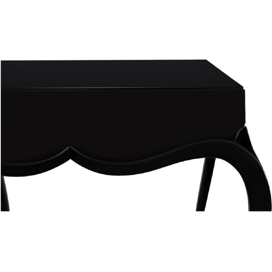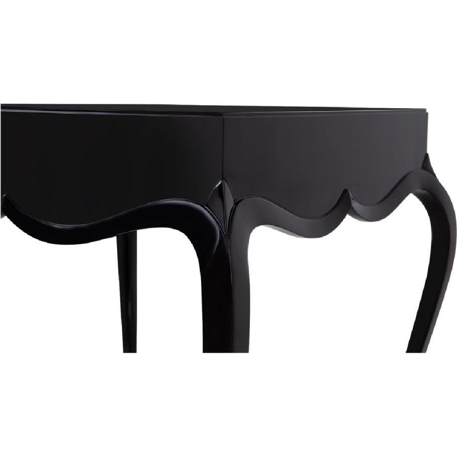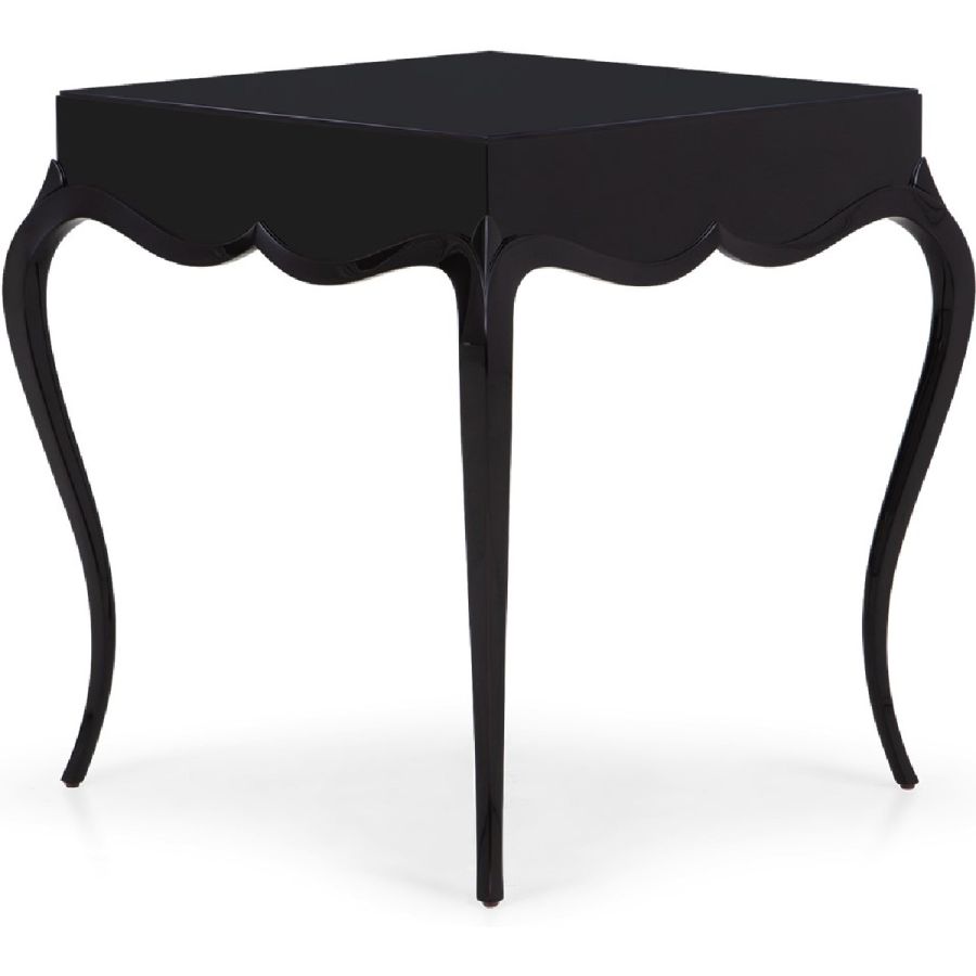 A highly desirable end table crafted from solid and veneered mahogany with delicate saber legs and beautiful diamond keyhole decorative detailing.
