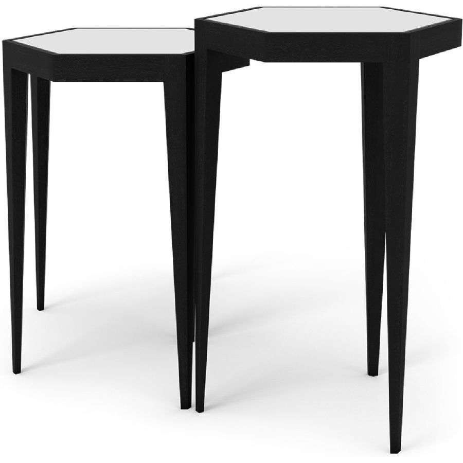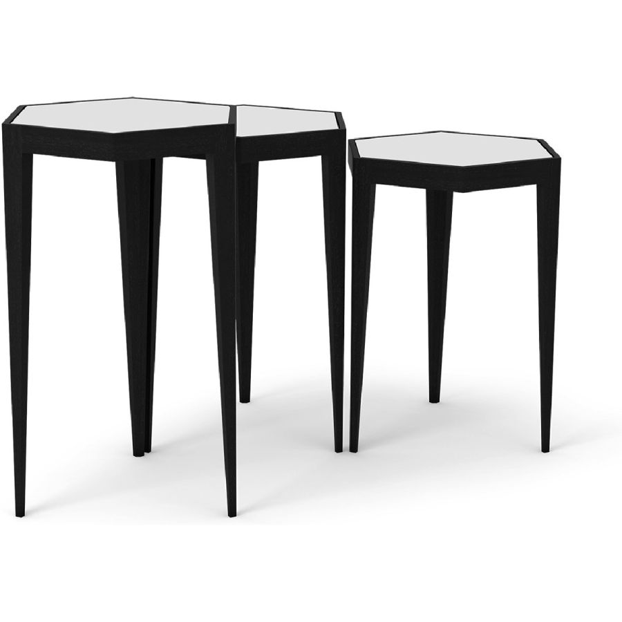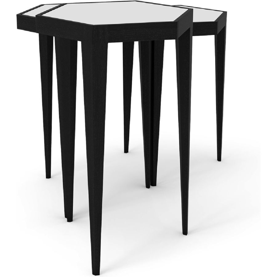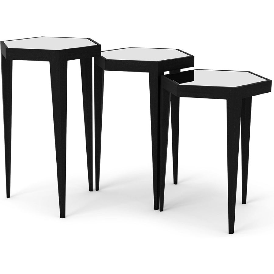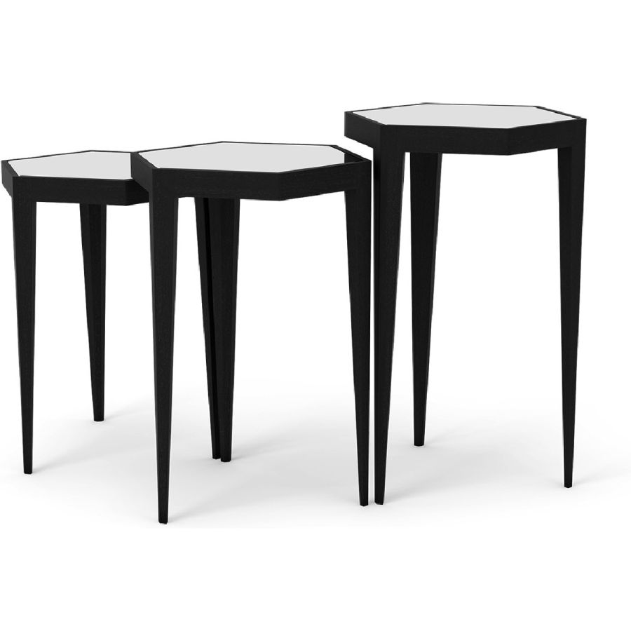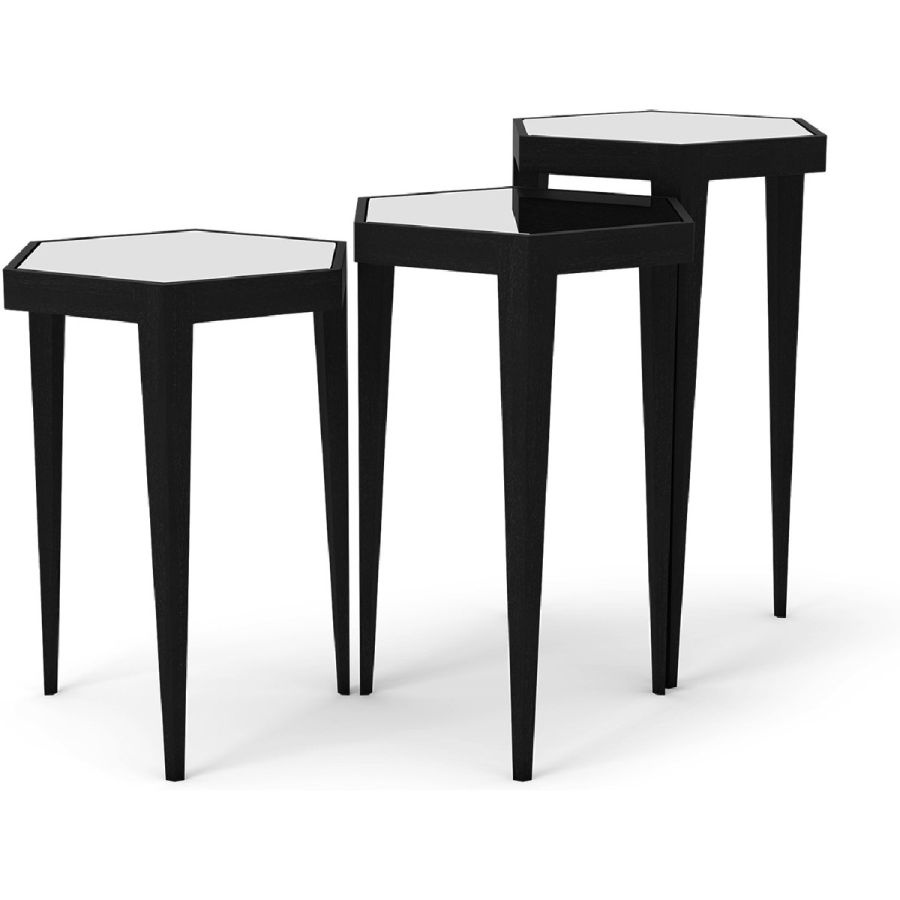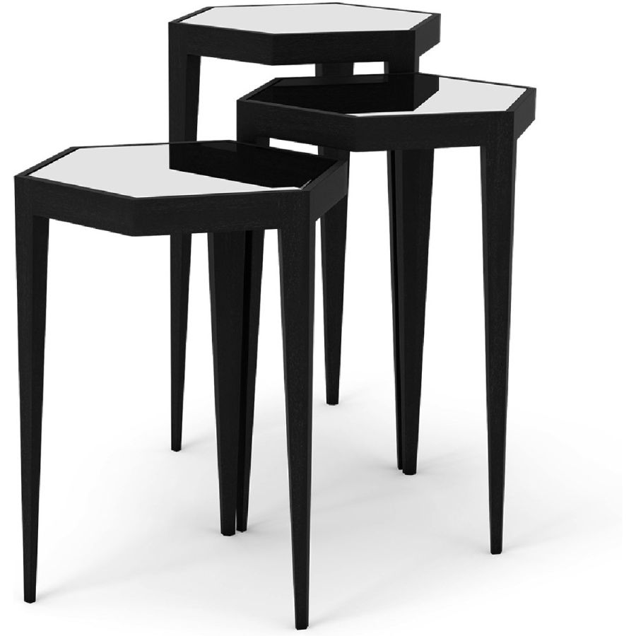 A charming set of three nesting tables with hexagonal tabletops. The tapered leg hand carved wood bases come in a selection of finishes and the tops come with leather or mirror inserts. Practical and beautiful, and suitable for any style of interior.