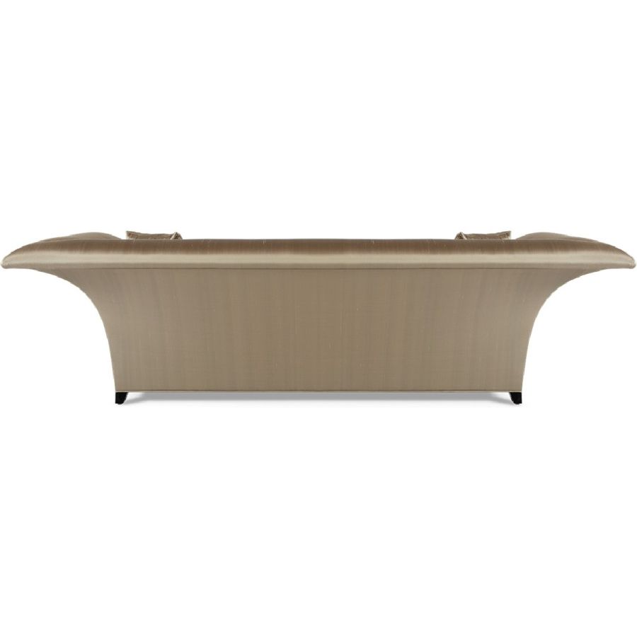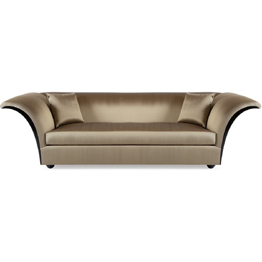 High sweeping sides with mahogany detailing soften the squared frame and sleek single-seat upholstery of this spectacular sofa, creating a true modern classic.