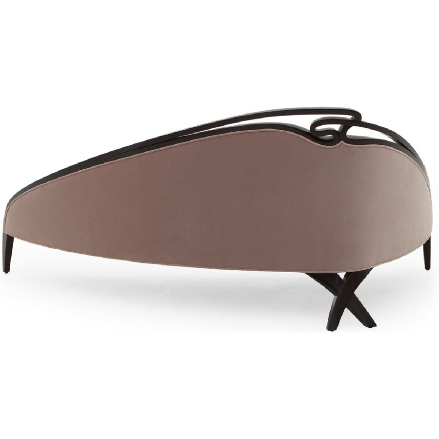 This curvaceous loveseat with its asymmetric left slant is topped by a intricate swirl of exquisite carving and the signature Chris-cross legs.