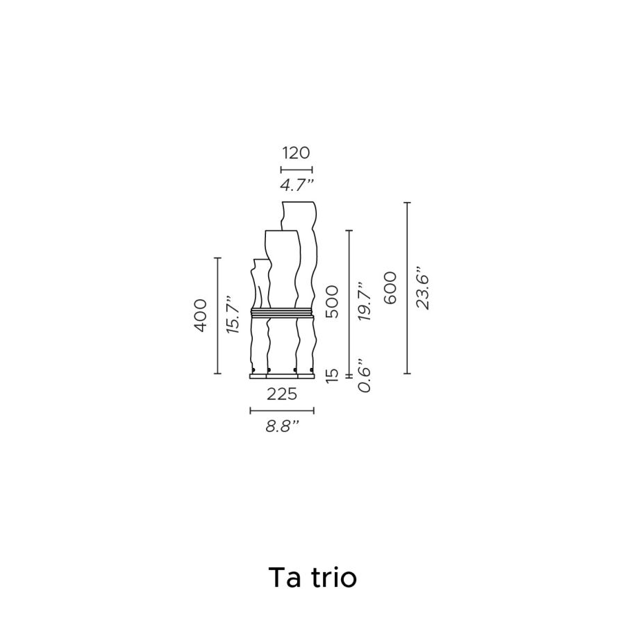 The Baggy Trio table lamp is composed of three elements in double-satin polycarbonate diffusers of different heights – 30, 50 and 60 cm – which have the irregular appearance of crumpled paper tubes, while the base is in grey finish. The distinctive soft textile cord in white/grey – a detail that expresses the brand’s archi-decorative stylistic code – becomes a joining element for the table and floor variants and supports the lamp in the suspended version.
